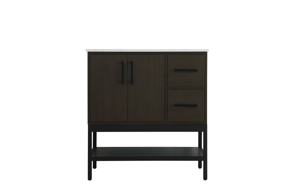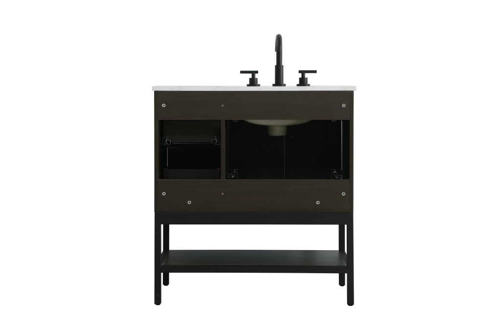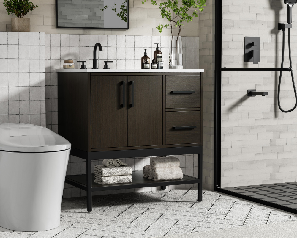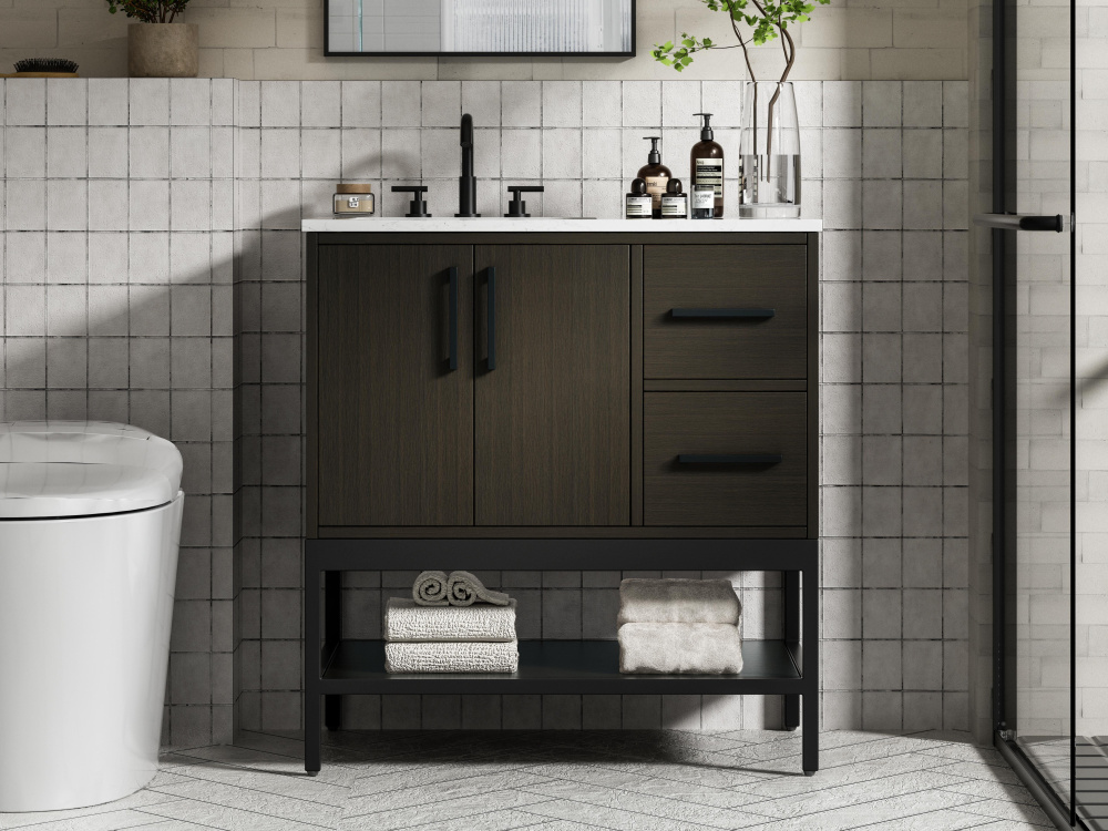 Upgrade your bathroom with this modern bathroom vanity that combines form and function effortlessly. Its sleek wood veneer cabinetry, paired with a bold black metal frame, brings a clean, contemporary vibe to any space. Designed with practicality in mind, the cabinet organizes your essentials, as well as an open lower shelf for added storage or display. The durable engineered marble countertop is built to withstand daily use, while the undermount porcelain sink ensures easy maintenance. Complete with matte black hardware and pre-drilled features for effortless installation, this vanity is the perfect centerpiece to refresh your bathroom with style and efficiency.