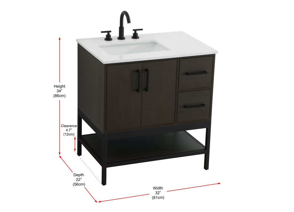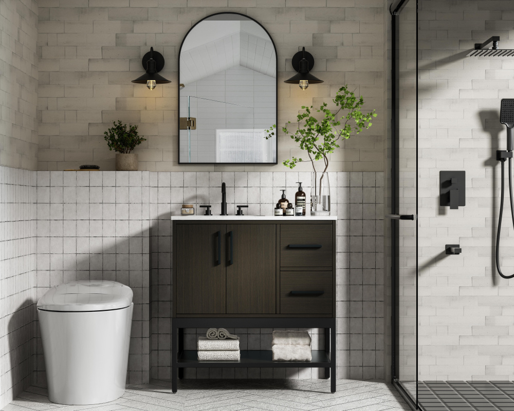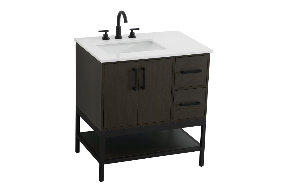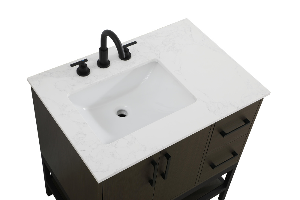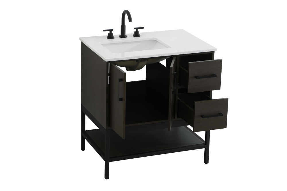 Upgrade your bathroom with this modern bathroom vanity that combines form and function effortlessly. Its sleek wood veneer cabinetry, paired with a bold black metal frame, brings a clean, contemporary vibe to any space. Designed with practicality in mind, the cabinet organizes your essentials, as well as an open lower shelf for added storage or display. The durable engineered marble countertop is built to withstand daily use, while the undermount porcelain sink ensures easy maintenance. Complete with matte black hardware and pre-drilled features for effortless installation, this vanity is the perfect centerpiece to refresh your bathroom with style and efficiency.