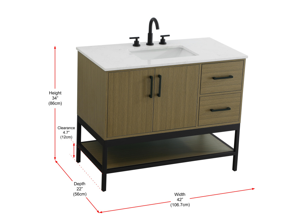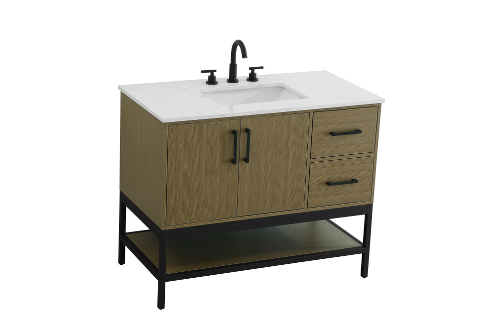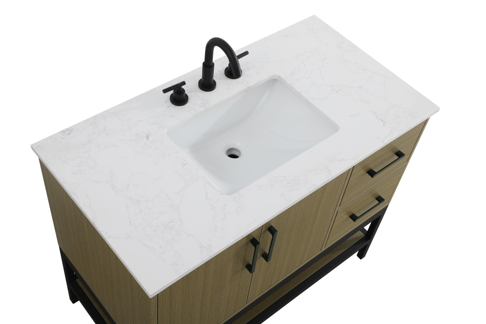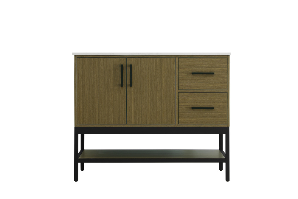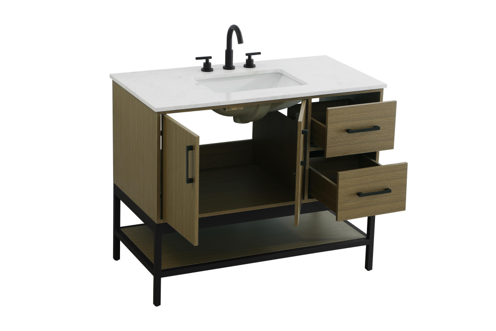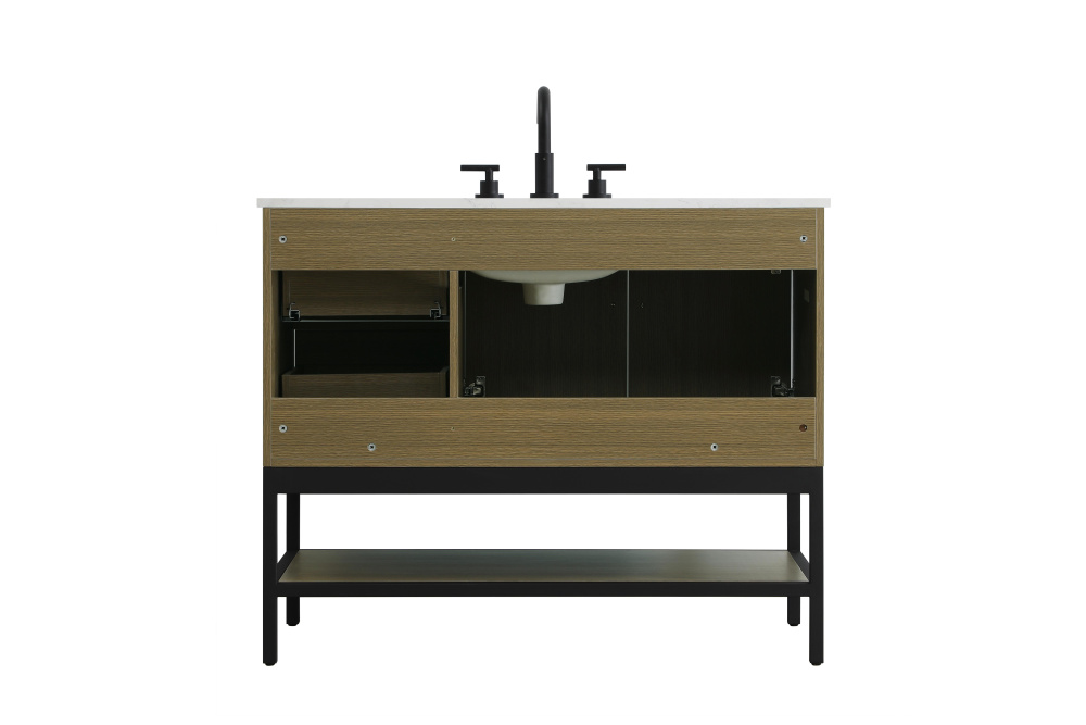 Upgrade your bathroom with this modern bathroom vanity that combines form and function effortlessly. Its sleek wood veneer cabinetry, paired with a bold black metal frame, brings a clean, contemporary vibe to any space. Designed with practicality in mind, this vanity offers soft-close drawers and cabinets to organize your essentials, as well as an open lower shelf for added storage or display. The durable white quartz countertop is built to withstand daily use, while the undermount ceramic sink ensures easy maintenance. Complete with matte black hardware and pre-drilled features for effortless installation, this vanity is the perfect centerpiece to refresh your bathroom with style and efficiency.
