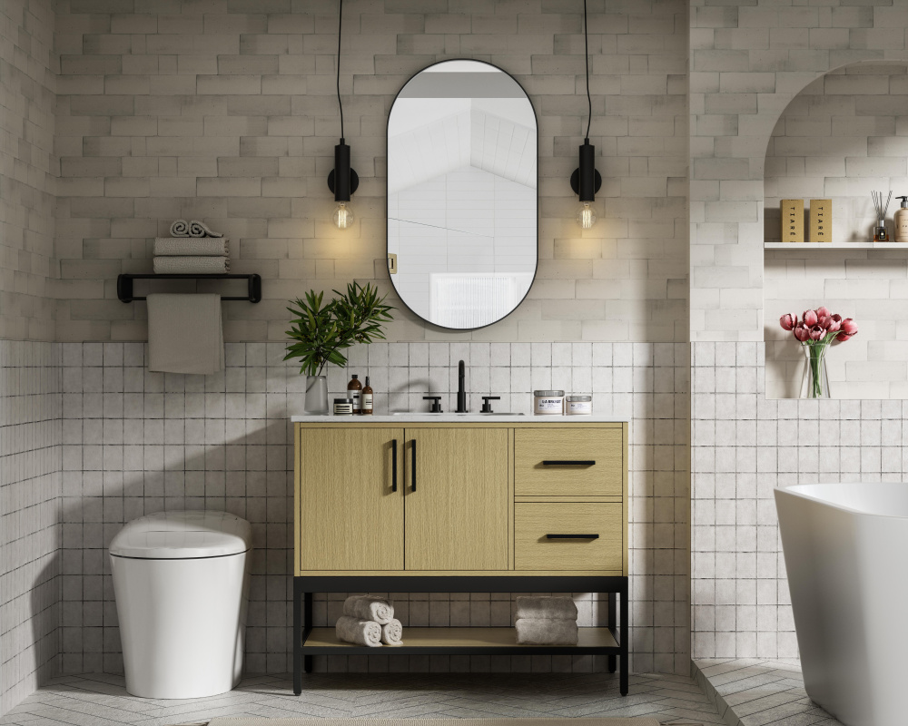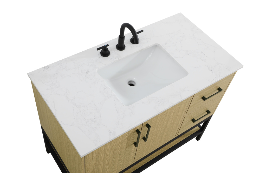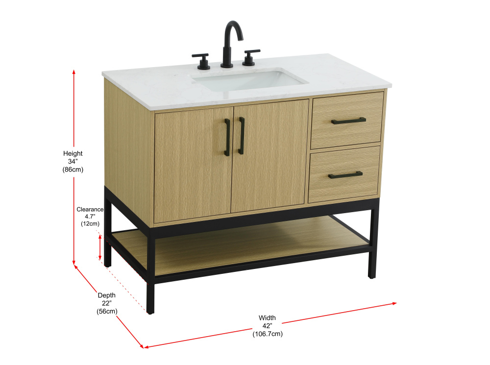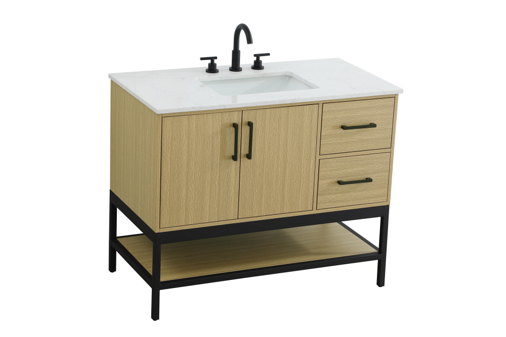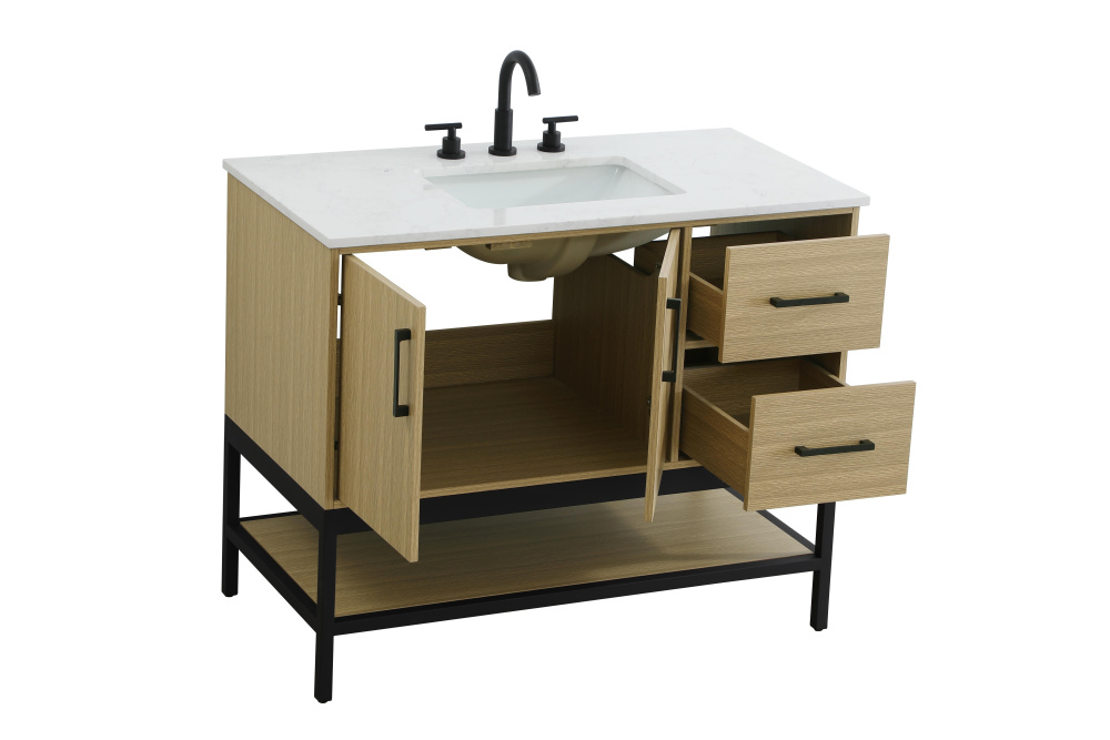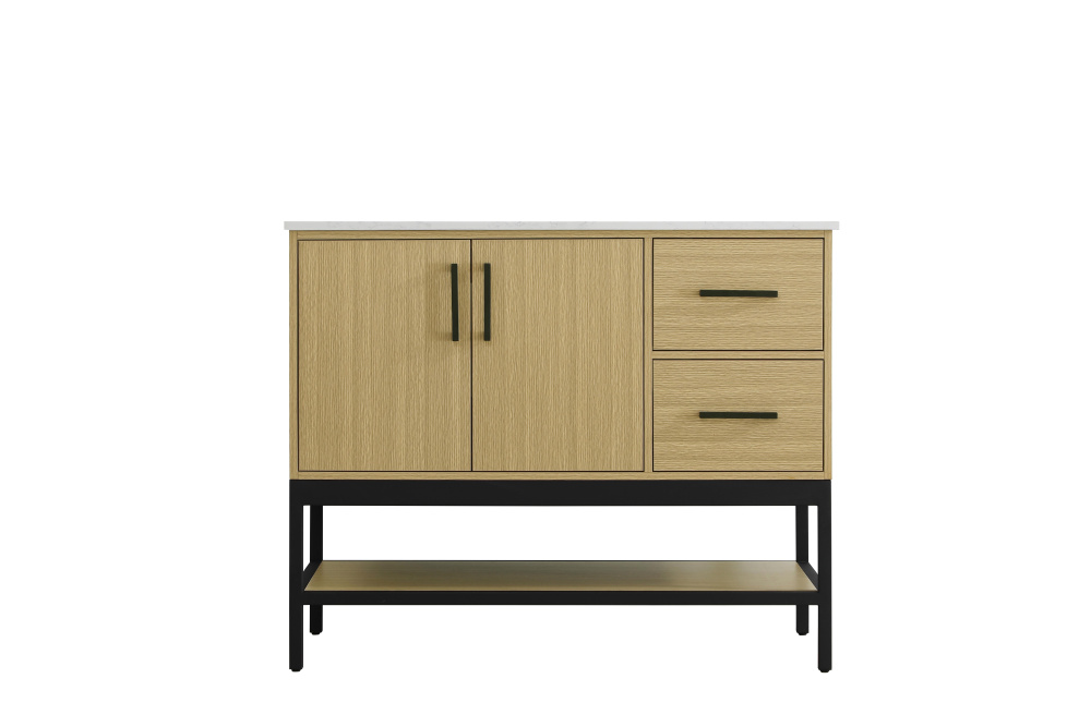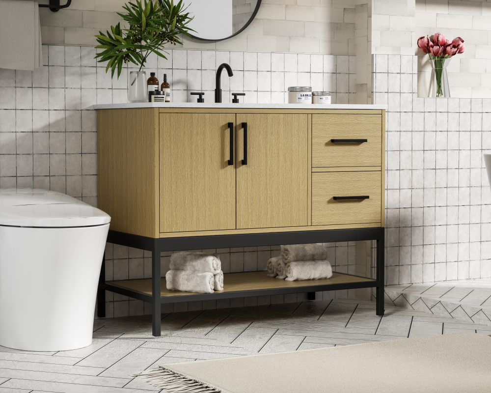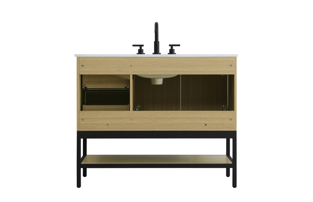 Upgrade your bathroom with this modern bathroom vanity that combines form and function effortlessly. Its sleek wood veneer cabinetry, paired with a bold black metal frame, brings a clean, contemporary vibe to any space. Designed with practicality in mind, this vanity offers soft-close drawers and cabinets to organize your essentials, as well as an open lower shelf for added storage or display. The durable white quartz countertop is built to withstand daily use, while the undermount ceramic sink ensures easy maintenance. Complete with matte black hardware and pre-drilled features for effortless installation, this vanity is the perfect centerpiece to refresh your bathroom with style and efficiency.
