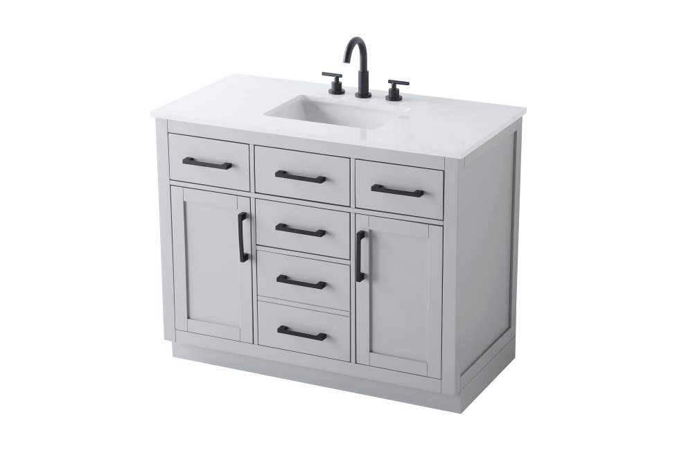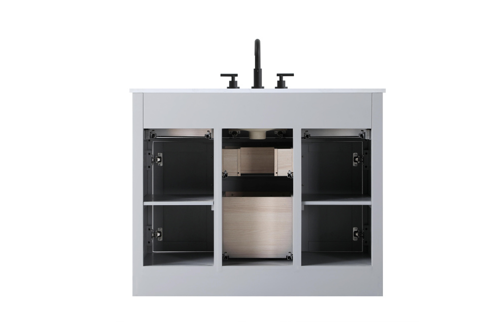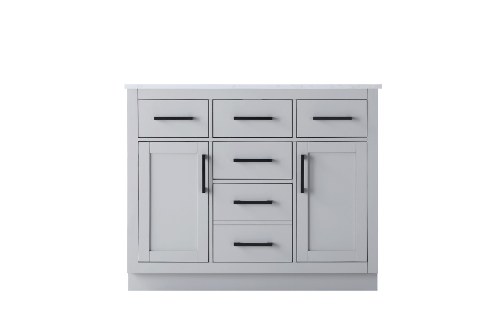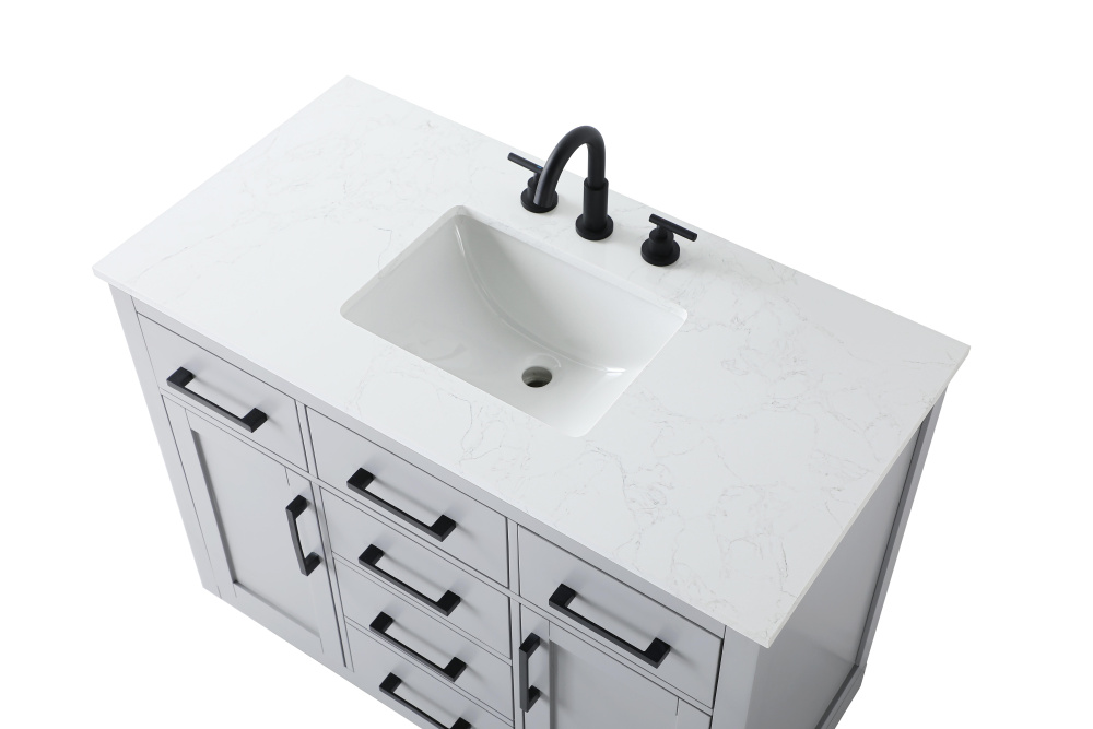 Engineered marble countertop with subtle grey marbling adds sophistication.