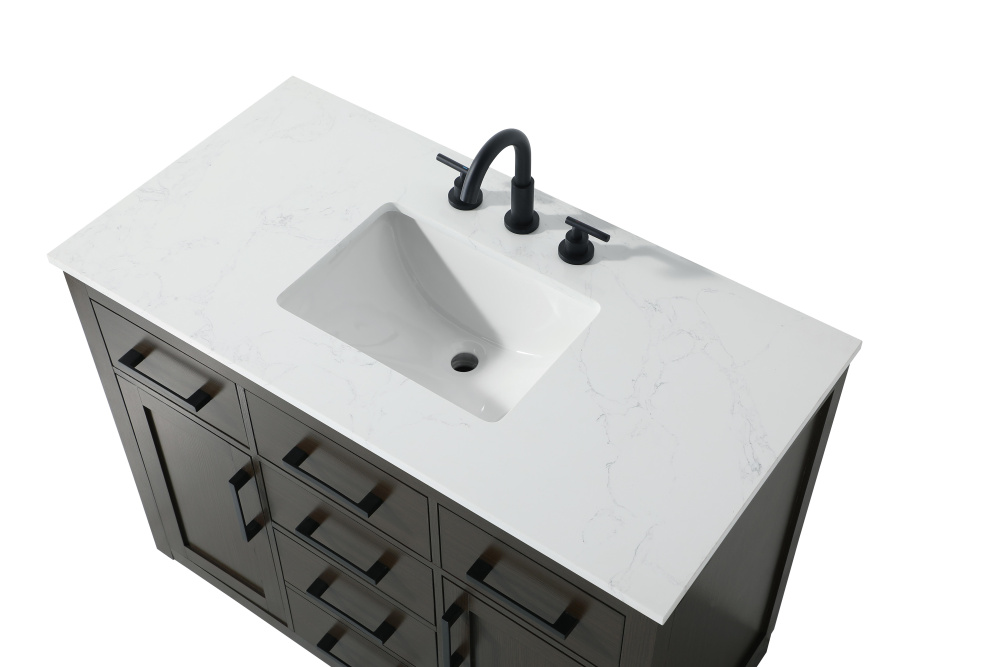 Engineered marble countertop with subtle grey marbling adds sophistication.