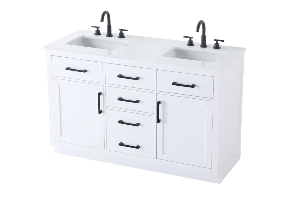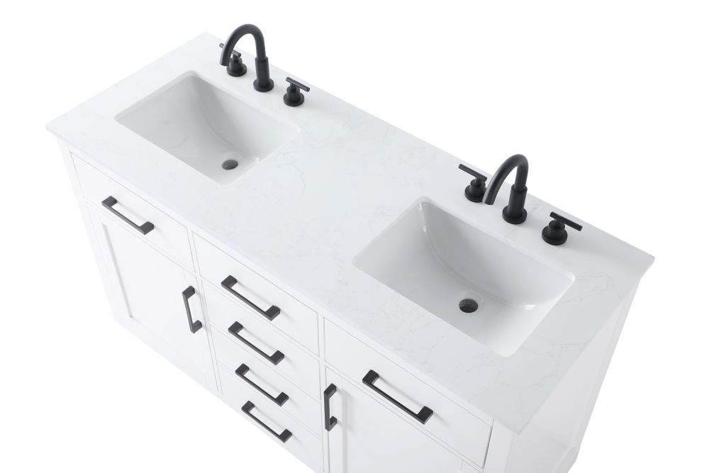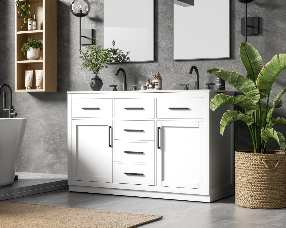 Introduce a perfect balance of functionality and style to your bathroom with this thoughtfully designed vanity. Constructed with a combination of solid wood and MDF, it offers durability and a sturdy build. The sleek engineered marble countertop with subtle grey marbling complements the rustic wood grain finish, creating a stylish and inviting centerpiece for your bathroom. Designed in a contemporary style with a transitional flair, it features a U-shaped shelf for seamless plumbing integration and multiple soft-close drawers for clutter-free organization. A pull-down drawer enhances convenience, while the toe kick adds a refined, clean-lined appearance and simplifies cleaning underneath. Matte black hardware contrasts beautifully with the cabinet finish, tying the look together. Delivered fully assembled and equipped with foot levelers, this vanity combines practicality and aesthetic appeal to suit modern and transitional bathrooms alike.