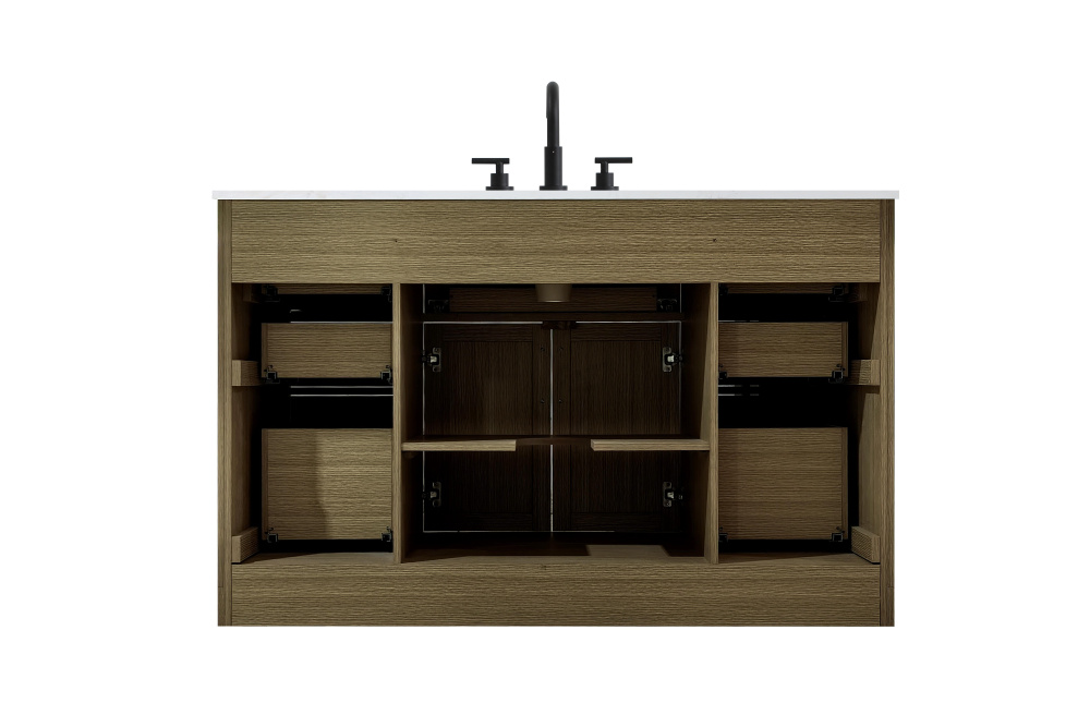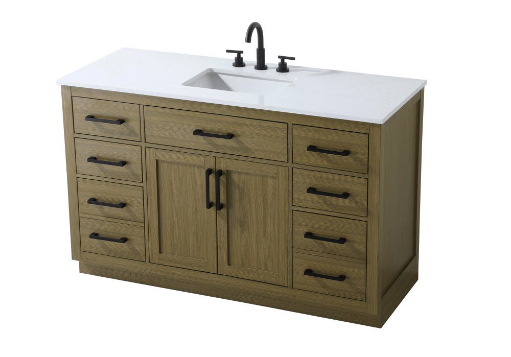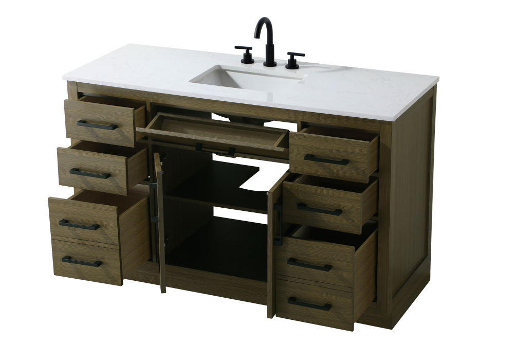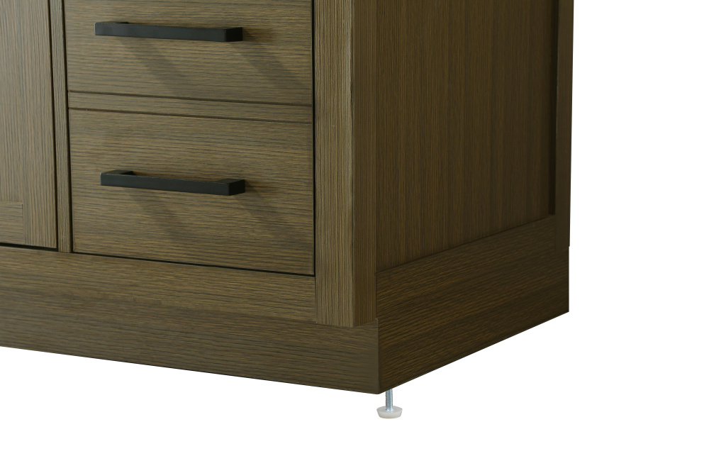 Introduce a perfect balance of functionality and style to your bathroom with this thoughtfully designed vanity. Constructed with a combination of solid wood and MDF, it offers durability and a sturdy build. The sleek engineered marble countertop with subtle grey marbling complements the rustic wood grain finish, creating a stylish and inviting centerpiece for your bathroom. Designed in a contemporary style with a transitional flair, it features a U-shaped shelf for seamless plumbing integration and multiple soft-close drawers for clutter-free organization. A pull-down drawer enhances convenience, while the toe kick adds a refined, clean-lined appearance and simplifies cleaning underneath. Matte black hardware contrasts beautifully with the cabinet finish, tying the look together. Delivered fully assembled and equipped with foot levelers, this vanity combines practicality and aesthetic appeal to suit modern and transitional bathrooms alike.