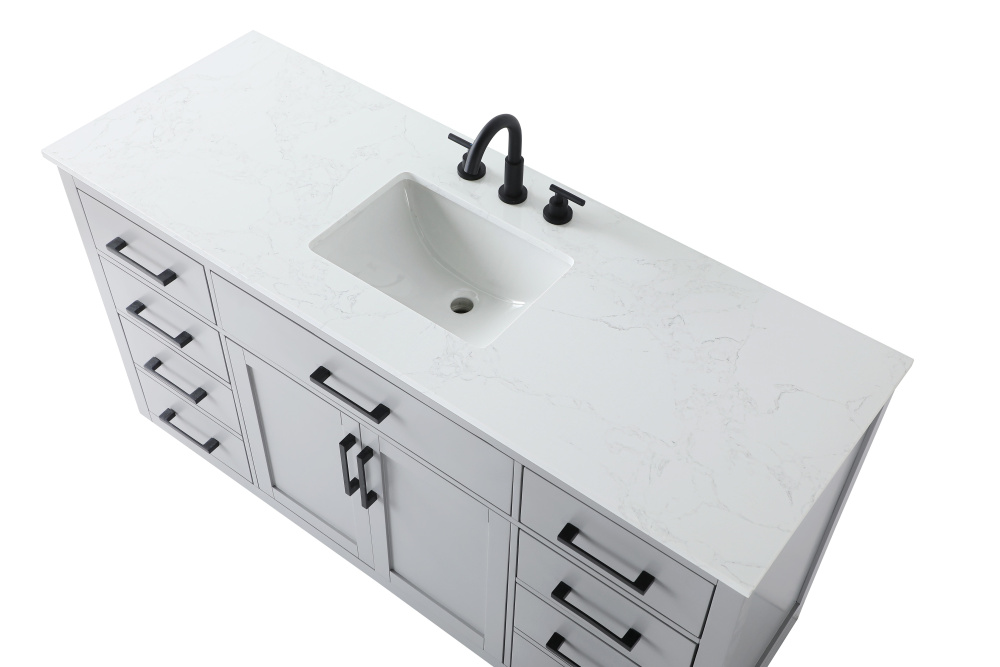 Introduce a perfect balance of functionality and style to your bathroom with this thoughtfully designed vanity. Constructed with a combination of solid wood and MDF, it offers durability and a sturdy build. The sleek engineered marble countertop with subtle grey marbling complements the rustic wood grain finish, creating a stylish and inviting centerpiece for your bathroom. Designed in a contemporary style with a transitional flair, it features a U-shaped shelf for seamless plumbing integration and multiple soft-close drawers for clutter-free organization. A pull-down drawer enhances convenience, while the toe kick adds a refined, clean-lined appearance and simplifies cleaning underneath. Matte black hardware contrasts beautifully with the cabinet finish, tying the look together. Delivered fully assembled and equipped with foot levelers, this vanity combines practicality and aesthetic appeal to suit modern and transitional bathrooms alike.
