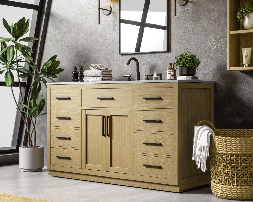 Perfectly suited for transitional and contemporary bathroom designs, this vanity seamlessly blends rustic and modern elements while being crafted from solid wood and MDF for exceptional durability and strength.