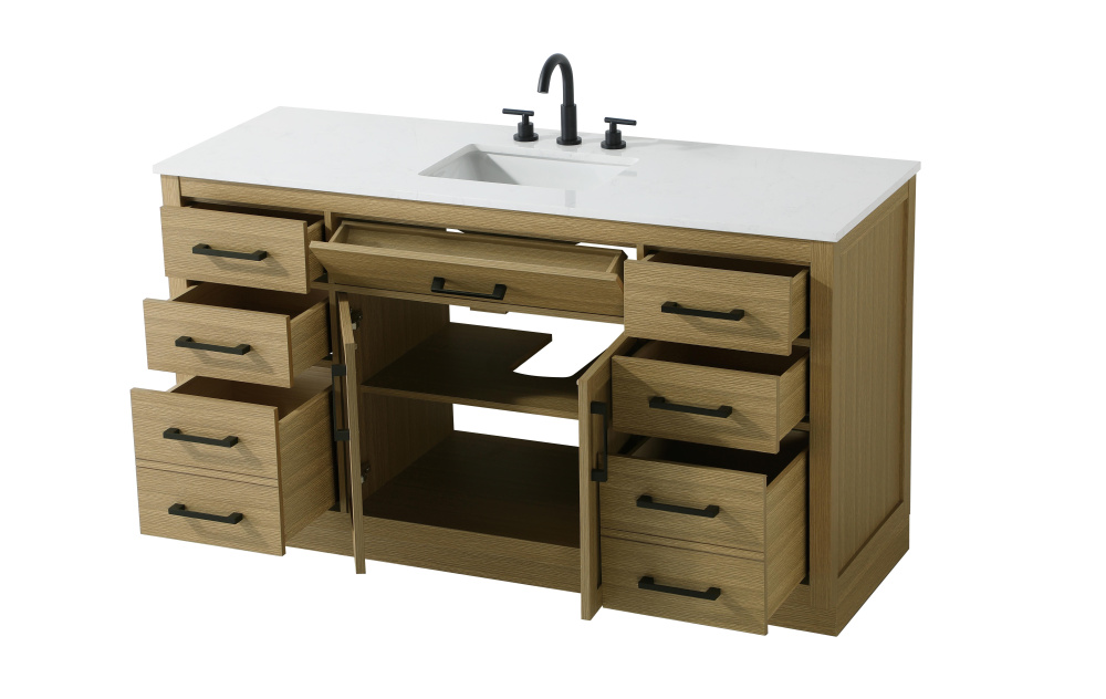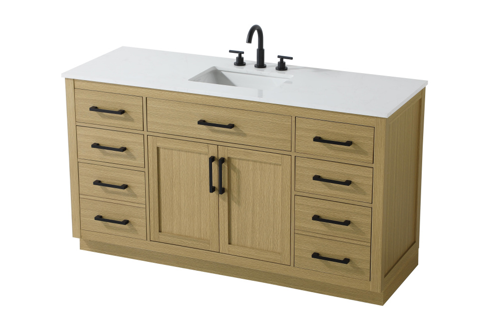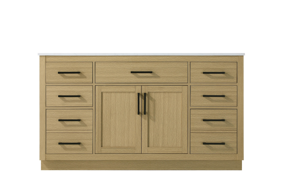 Introduce a perfect balance of functionality and style to your bathroom with this thoughtfully designed vanity. Constructed with a combination of solid wood and MDF, it offers durability and a sturdy build. The sleek engineered marble countertop with subtle grey marbling complements the rustic wood grain finish, creating a stylish and inviting centerpiece for your bathroom. Designed in a contemporary style with a transitional flair, it features a U-shaped shelf for seamless plumbing integration and multiple soft-close drawers for clutter-free organization. A pull-down drawer enhances convenience, while the toe kick adds a refined, clean-lined appearance and simplifies cleaning underneath. Matte black hardware contrasts beautifully with the cabinet finish, tying the look together. Delivered fully assembled and equipped with foot levelers, this vanity combines practicality and aesthetic appeal to suit modern and transitional bathrooms alike.