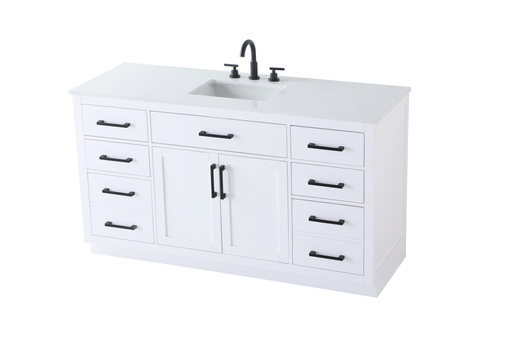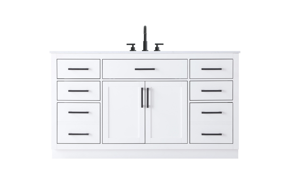 Introduce a perfect balance of functionality and style to your bathroom with this thoughtfully designed vanity. Constructed with a combination of solid wood and MDF, it offers durability and a sturdy build. The sleek engineered marble countertop with subtle grey marbling complements the rustic wood grain finish, creating a stylish and inviting centerpiece for your bathroom. Designed in a contemporary style with a transitional flair, it features a U-shaped shelf for seamless plumbing integration and multiple soft-close drawers for clutter-free organization. A pull-down drawer enhances convenience, while the toe kick adds a refined, clean-lined appearance and simplifies cleaning underneath. Matte black hardware contrasts beautifully with the cabinet finish, tying the look together. Delivered fully assembled and equipped with foot levelers, this vanity combines practicality and aesthetic appeal to suit modern and transitional bathrooms alike.