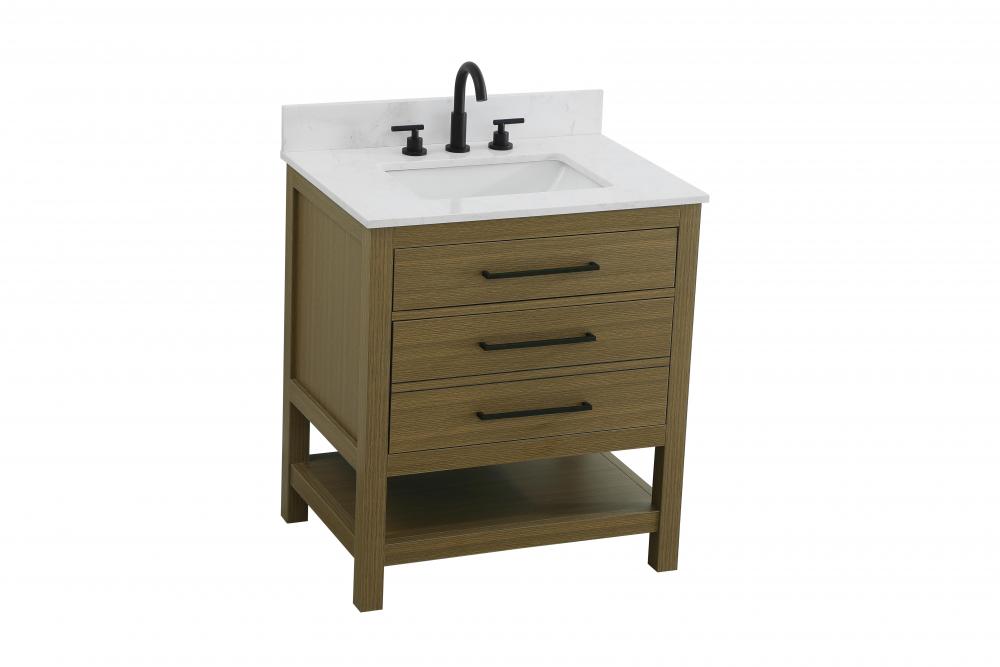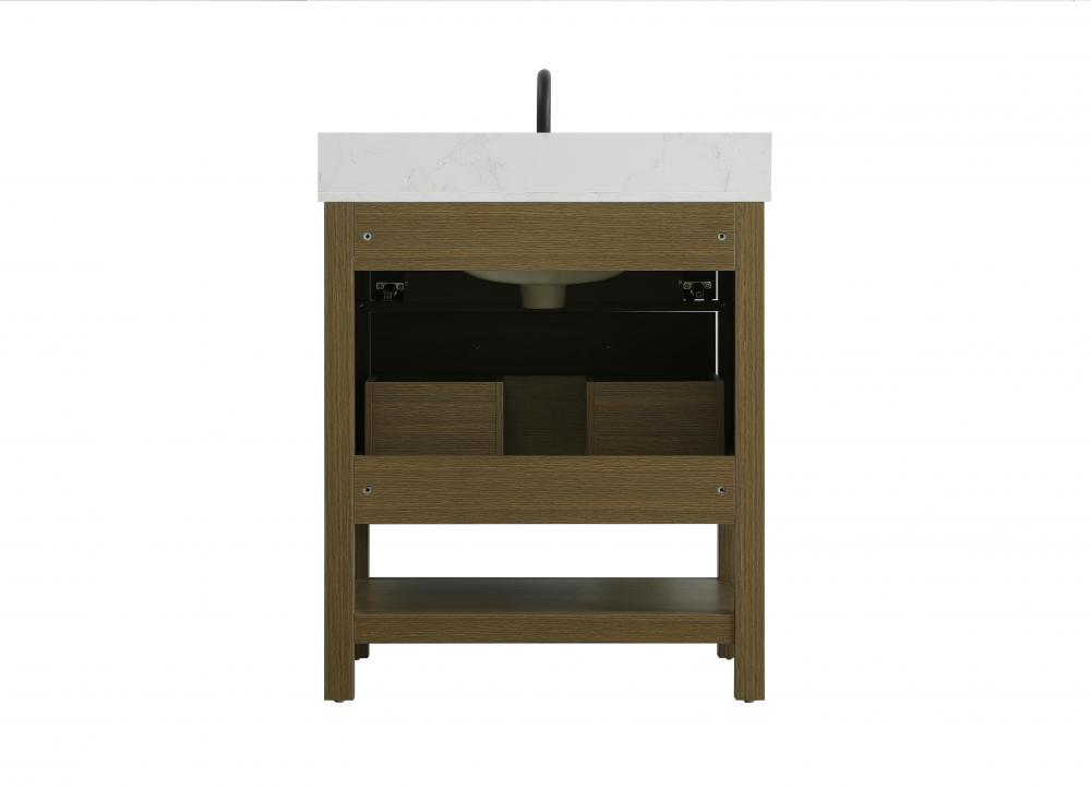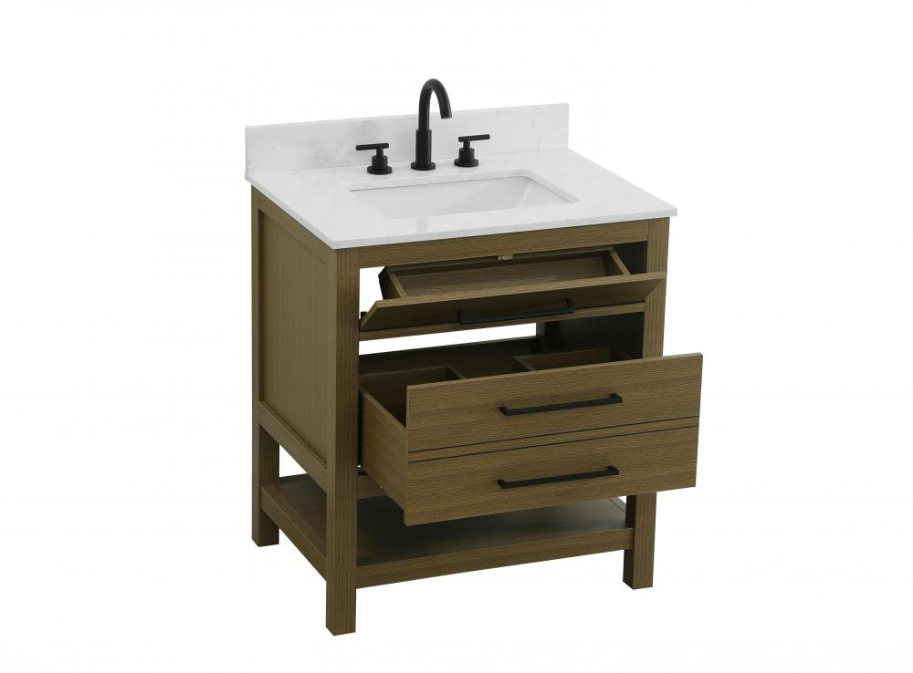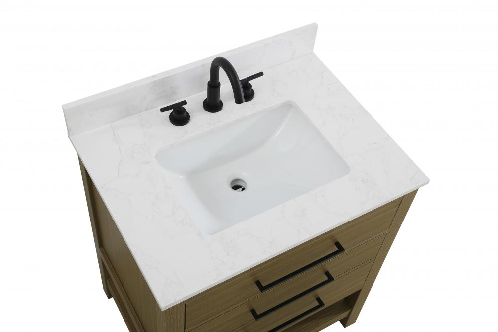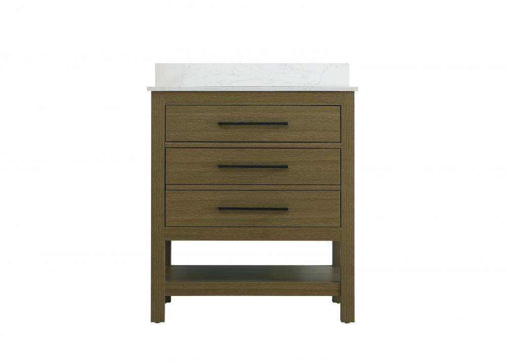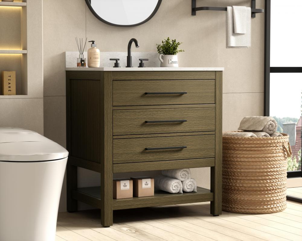 Elevate your bathroom design with this versatile and beautifully crafted bathroom vanity cabinet. The engineered marble top features striking veining, adding a luxurious focal point to your space. Built from premium solid wood and MDF, it ensures long-lasting durability and strength. The porcelain sink, complete with a concealed overflow, offers a seamless and refined finish. Available in four stunning finishes—Chestnut Brown, Honey Brown, Mocha Brown, and White—this vanity suits any interior style. Designed with convenience in mind, it features soft-closing drawers with modern handles and a tip-out drawer for easy access to small essentials, keeping your space tidy. The bottom deep drawer mimics the appearance of two separate drawers, providing ample storage for larger items, while the open shelf at the base offers additional storage space for towels or decor. Fully assembled for your convenience, it includes foot levelers for stability on any surface. For a complete look, pair it with a matching backsplash. UPC certified for quality assurance, this vanity is the perfect combination of functionality, style, and ease of use.