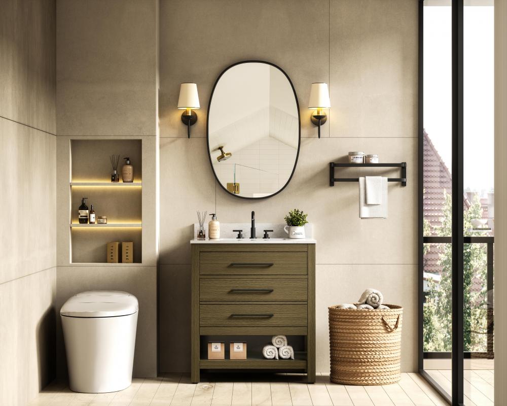 A functional tip-out drawer provides quick access to small items like toiletries, keeping your countertop clutter-free.