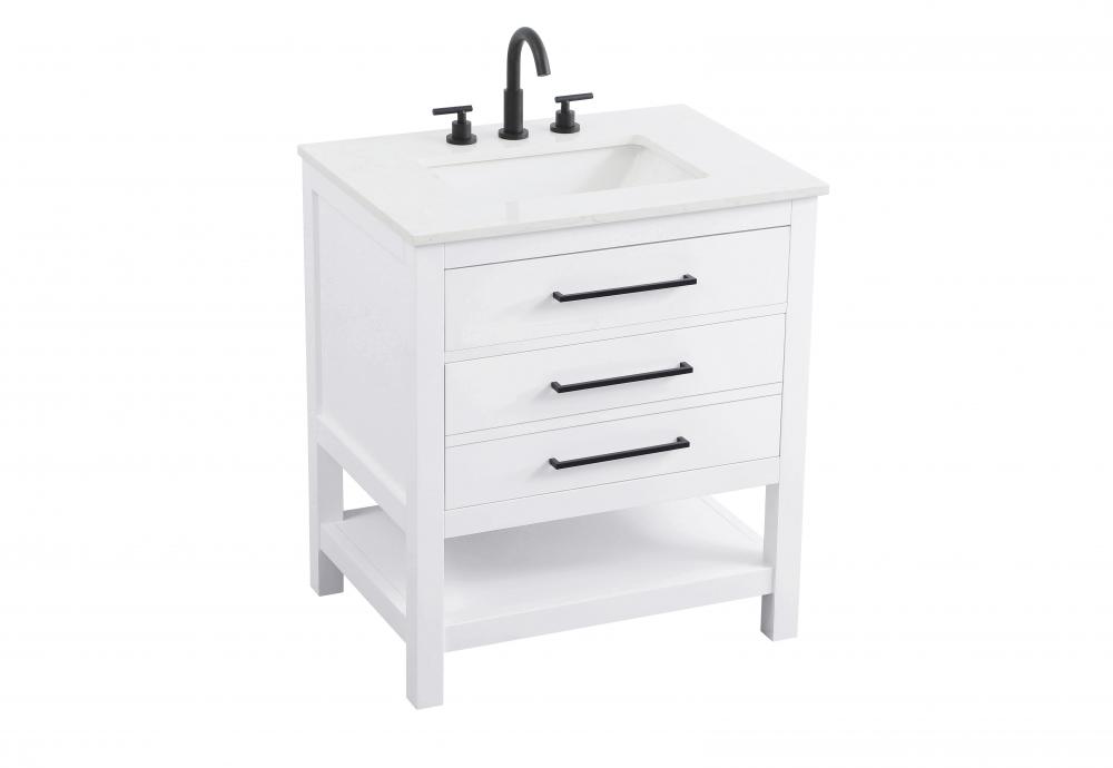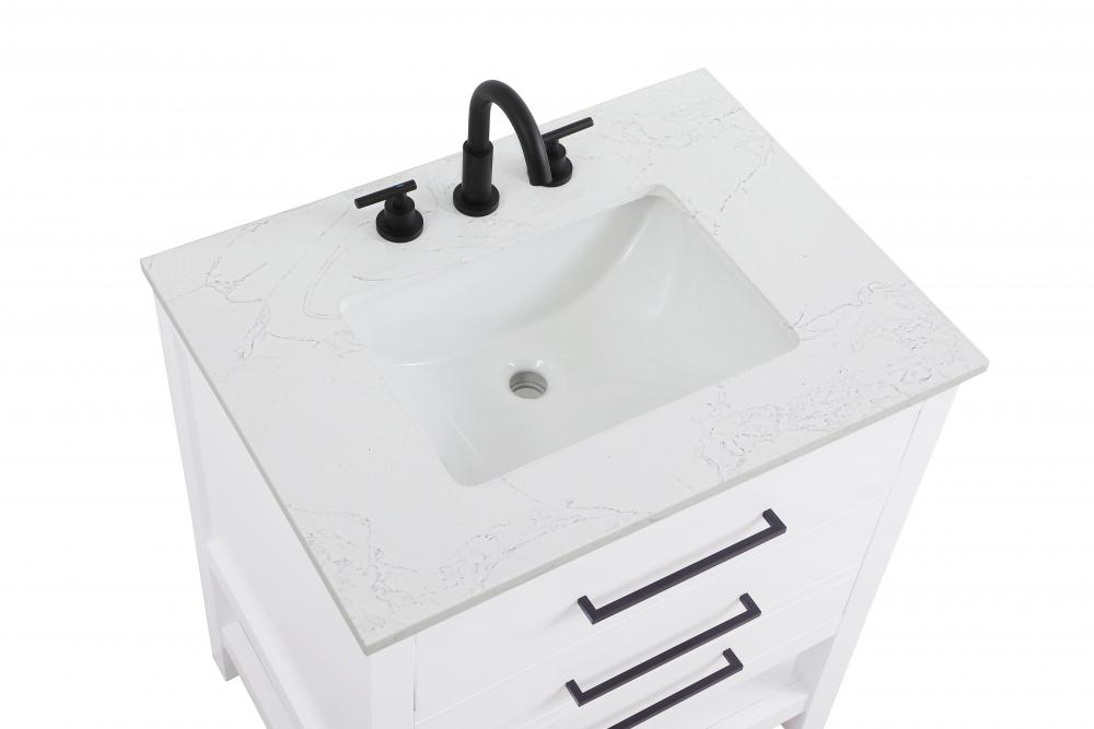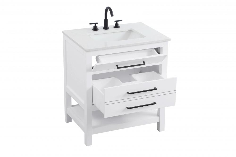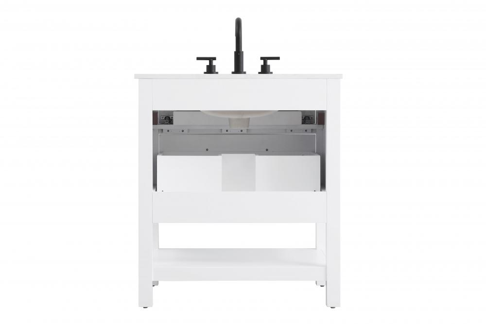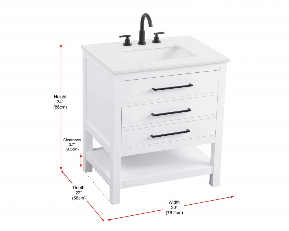 Elevate your bathroom design with this versatile and beautifully crafted bathroom vanity cabinet. The engineered marble top features striking veining, adding a luxurious focal point to your space. Built from premium solid wood and MDF, it ensures long-lasting durability and strength. The porcelain sink, complete with a concealed overflow, offers a seamless and refined finish.Available in four stunning finishes—Chestnut Brown, Honey Brown, Mocha Brown, and White—this vanity suits any interior style. Designed with convenience in mind, it features soft-closing drawers with modern handles and a tip-out drawer for easy access to small essentials, keeping your space tidy. The bottom deep drawer mimics the appearance of two separate drawers, providing ample storage for larger items, while the open shelf at the base offers additional storage space for towels or decor.Fully assembled for your convenience, it includes foot levelers for stability on any surface. For a complete look, pair it with an optional matching backsplash, sold separately. UPC certified for quality assurance, this vanity is the perfect combination of functionality, style, and ease of use.