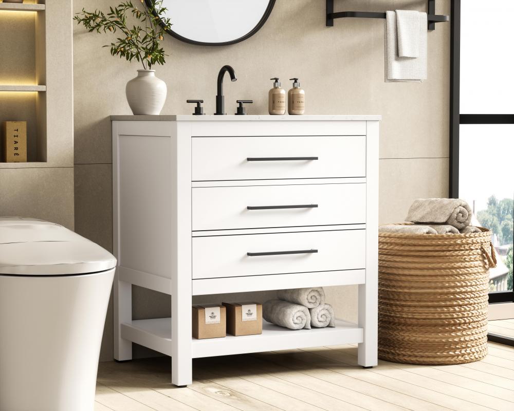 A functional tip-out drawer provides quick access to small items like toiletries, keeping your countertop clutter-free.