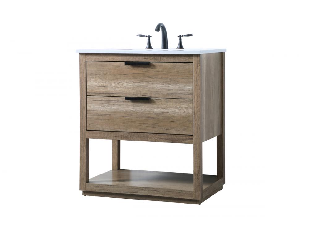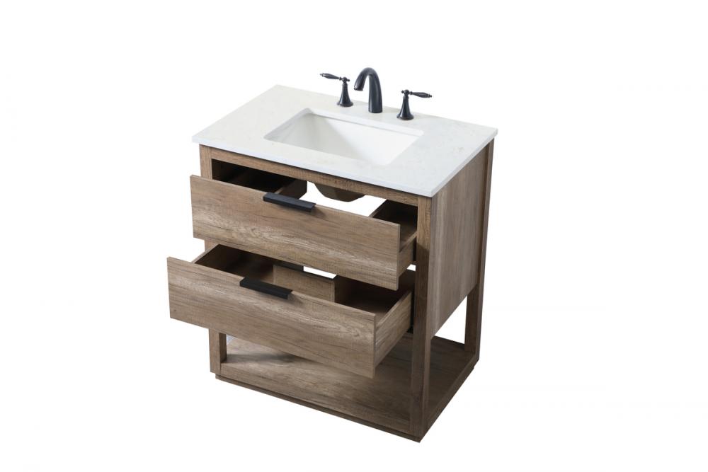 Elevate your bathroom effortlessly with our stylish vanity. Featuring an engineered marble top and chic straight edge cut, it brings a touch of modern elegance. The two soft-close drawers are adorned with sleek pulls, which offer both convenient storage and a contemporary aesthetic. Completing the ensemble, an undermount porcelain sink adds timeless charm. The vanity's open shelf at the bottom provides extra storage and a space to showcase decor. As a freestanding unit, this hassle-free solution requires no assembly. Customize your space effortlessly with this sophisticated option for instant bathroom elegance.