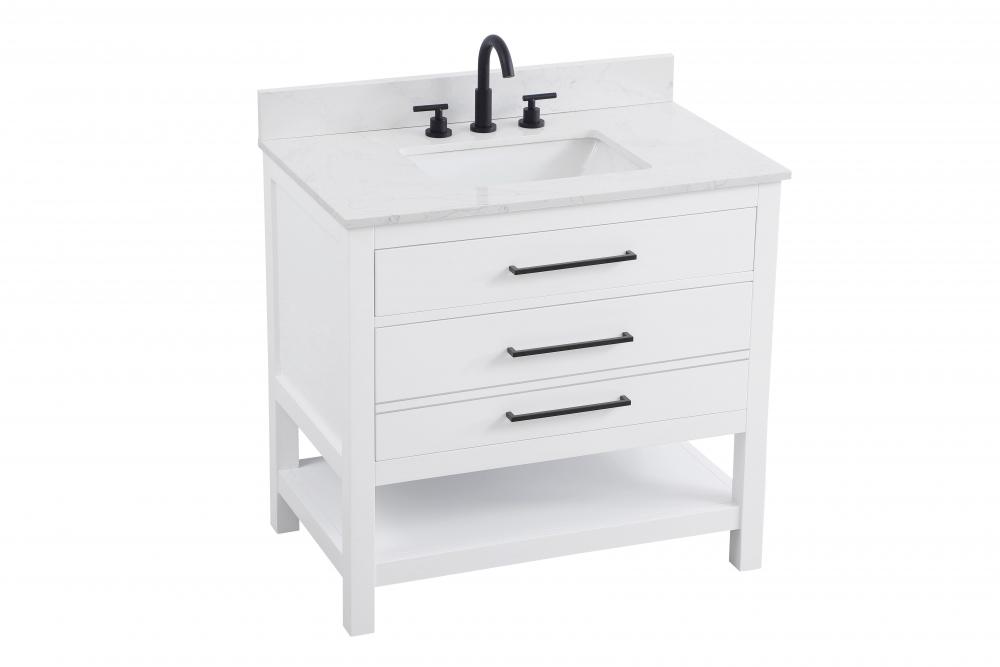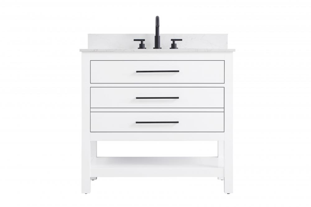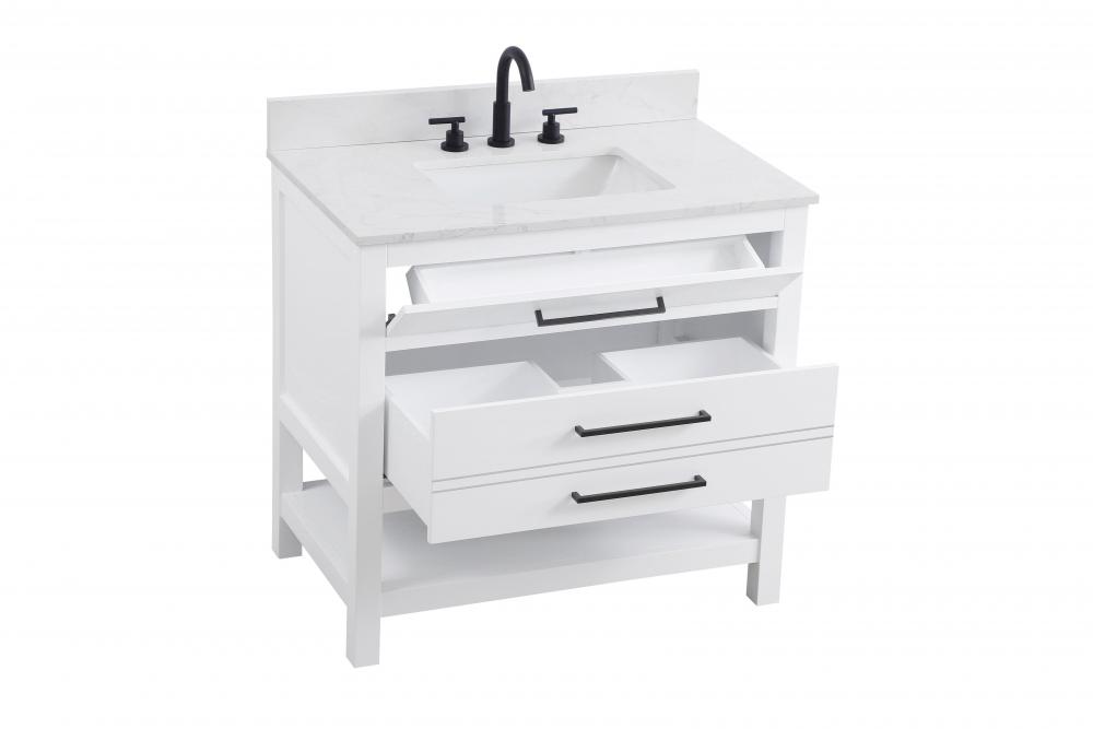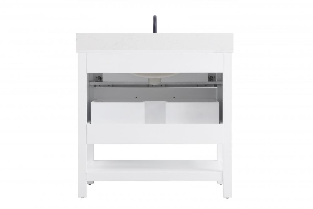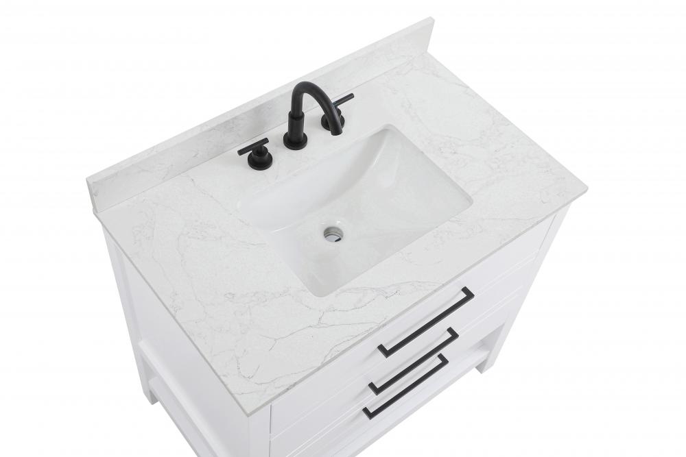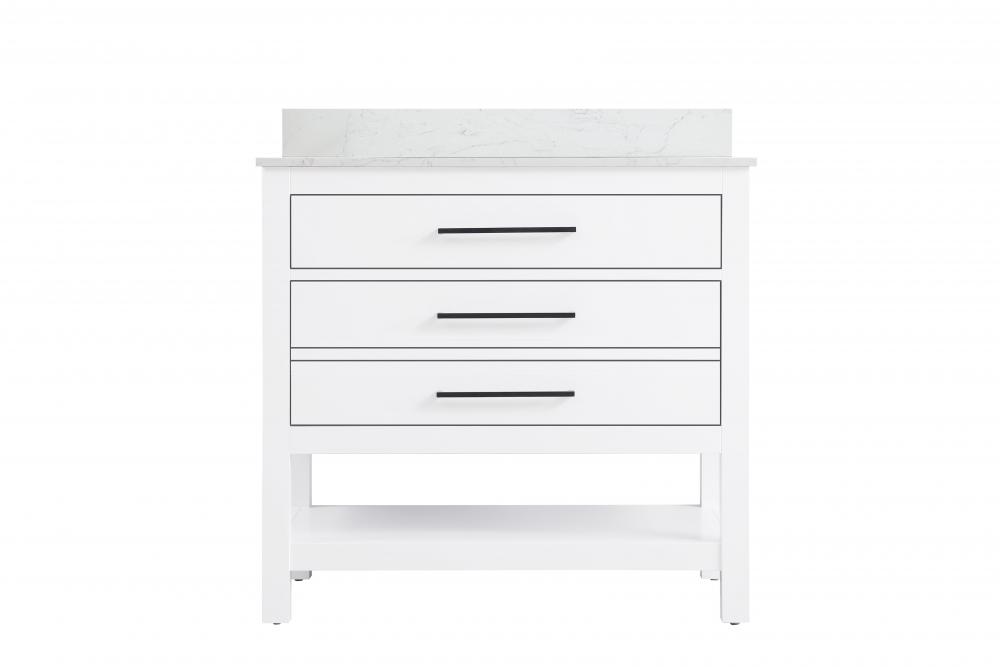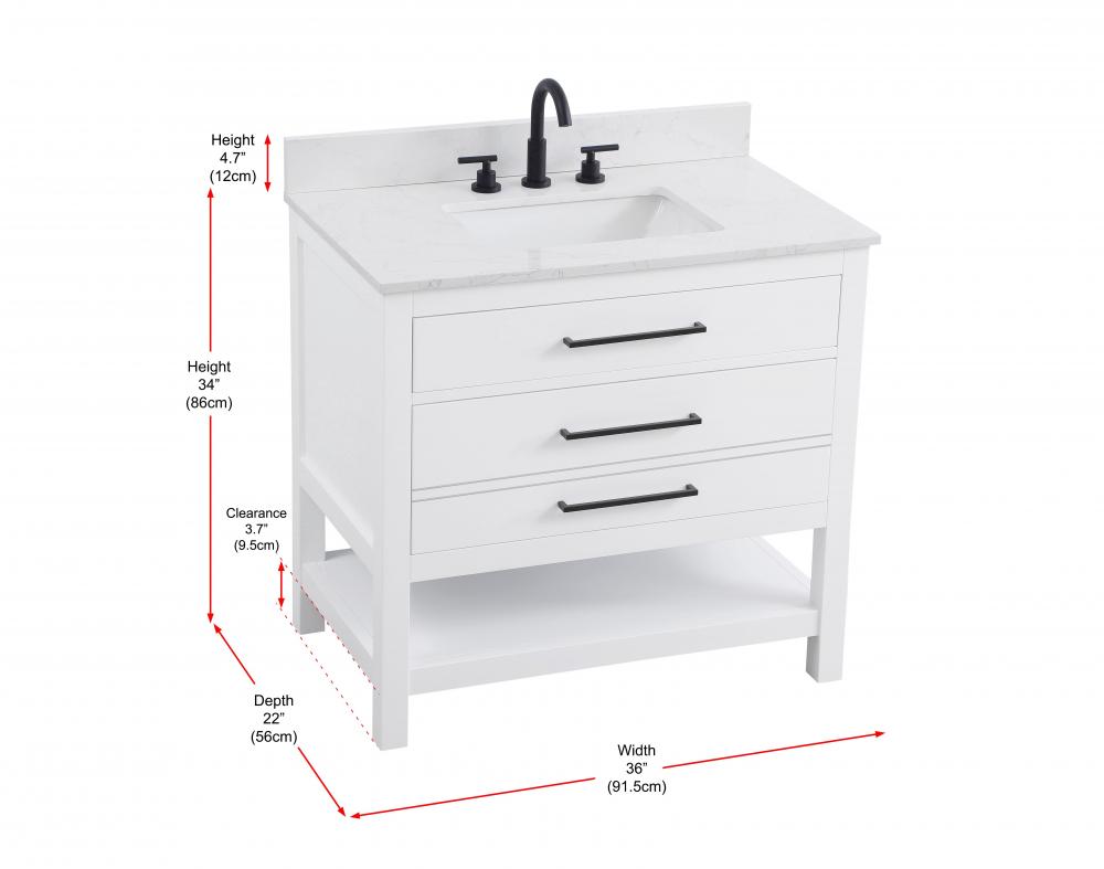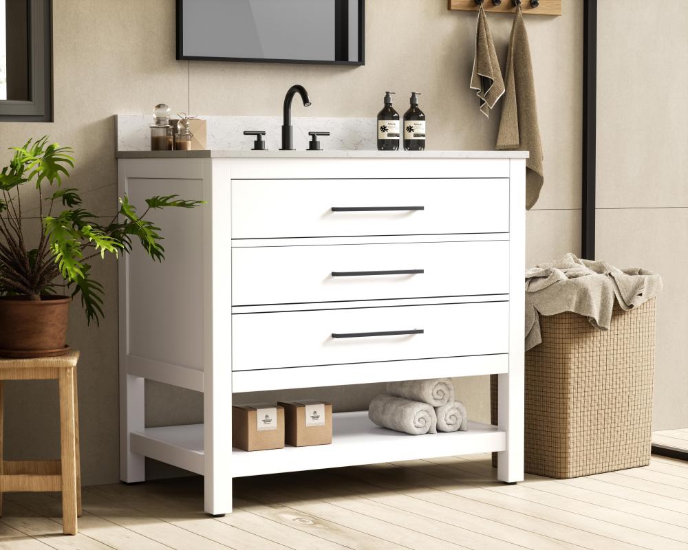 Elevate your bathroom design with this versatile and beautifully crafted bathroom vanity cabinet. The engineered marble top features striking veining, adding a luxurious focal point to your space. Built from premium solid wood and MDF, it ensures long-lasting durability and strength. The porcelain sink, complete with a concealed overflow, offers a seamless and refined finish. Available in four stunning finishes—Chestnut Brown, Honey Brown, Mocha Brown, and White—this vanity suits any interior style. Designed with convenience in mind, it features soft-closing drawers with modern handles and a tip-out drawer for easy access to small essentials, keeping your space tidy. The bottom deep drawer mimics the appearance of two separate drawers, providing ample storage for larger items, while the open shelf at the base offers additional storage space for towels or decor. Fully assembled for your convenience, it includes foot levelers for stability on any surface. For a complete look, pair it with a matching backsplash. UPC certified for quality assurance, this vanity is the perfect combination of functionality, style, and ease of use.