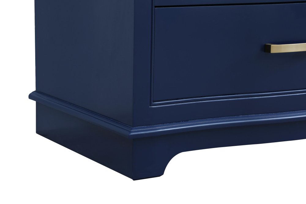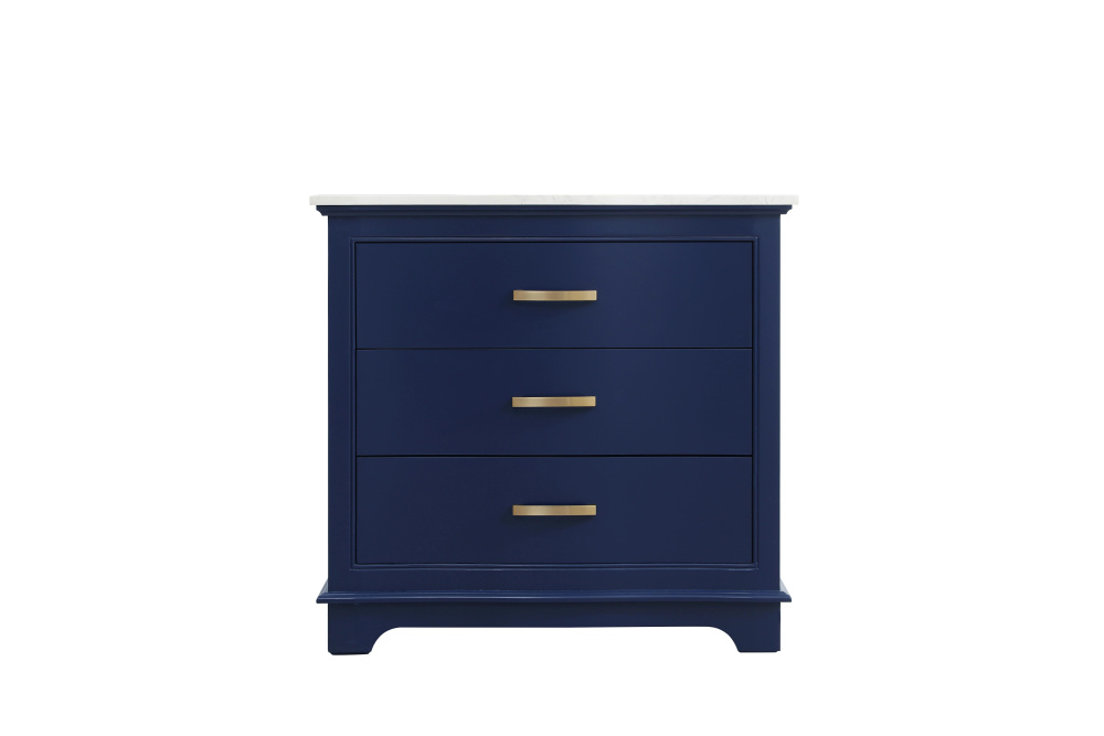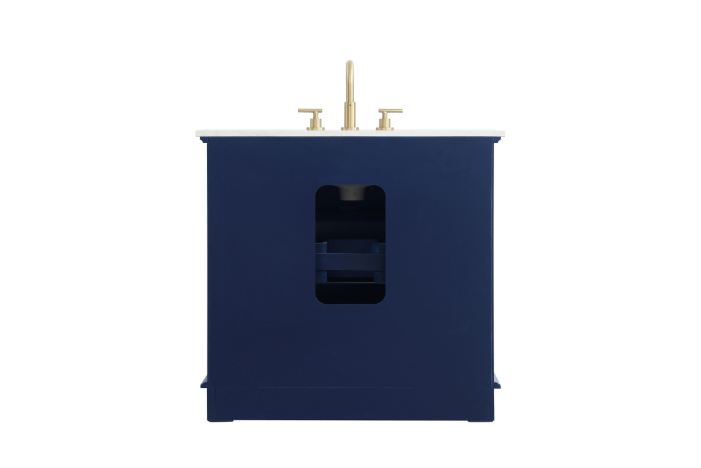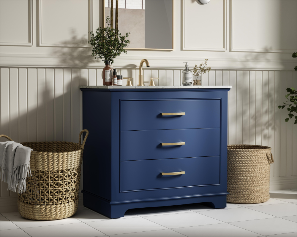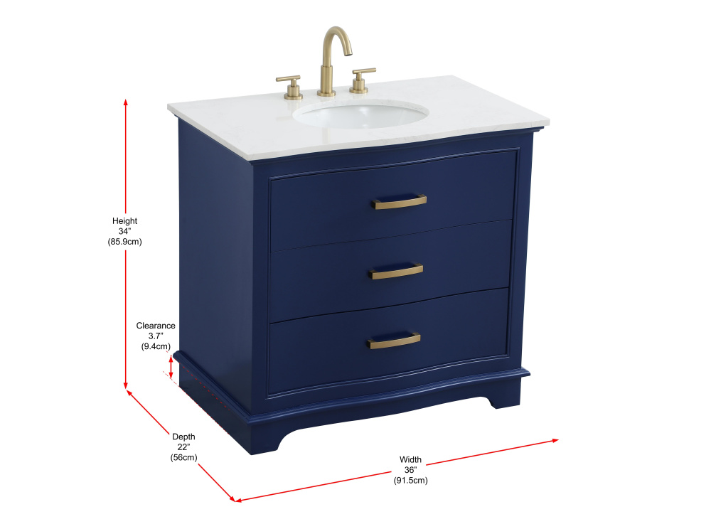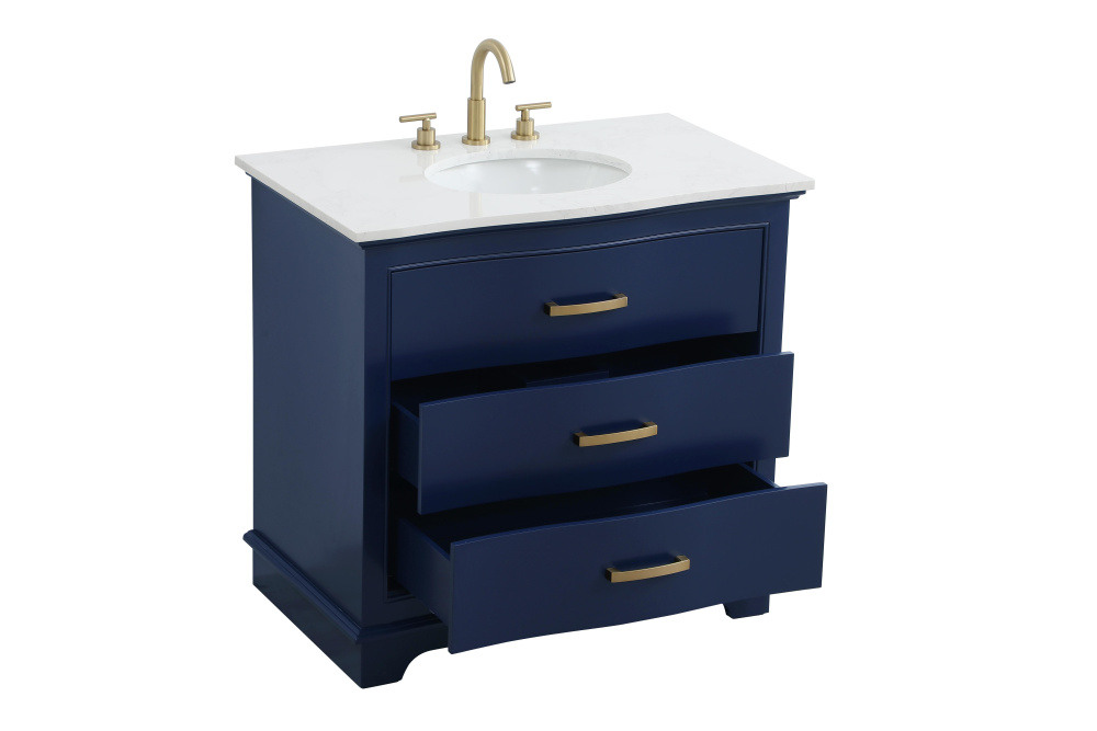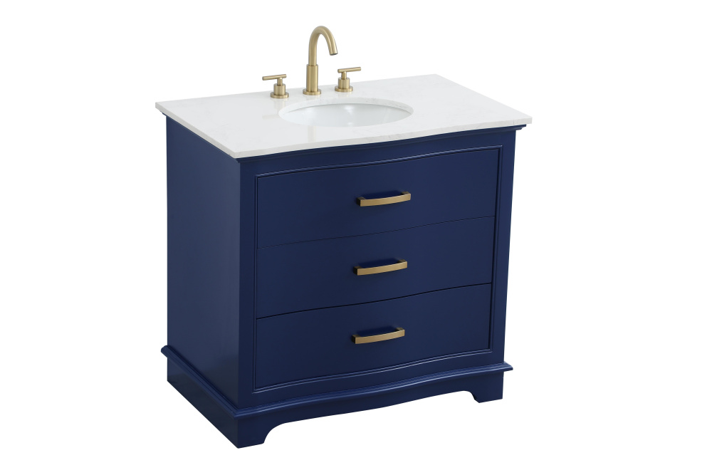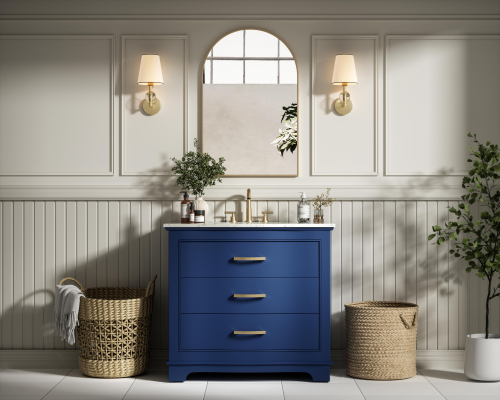 Enhance your bathroom with this expertly crafted vanity that combines functionality and timeless design. The slightly curved silhouette adds softness and sophistication, while the faux-marble countertop showcases unique veining for a one-of-a-kind look. Complete with a porcelain undermount sink, this vanity is available in White, Blue, and Grey finishes to complement any décor. Soft-closing drawers offer quiet and smooth storage access, including a U-shaped middle drawer designed to fit around plumbing. Built with solid wood and MDF for lasting durability, it also features adjustable foot levelers for stability and ships fully assembled, making it an effortless and stylish upgrade to your space.