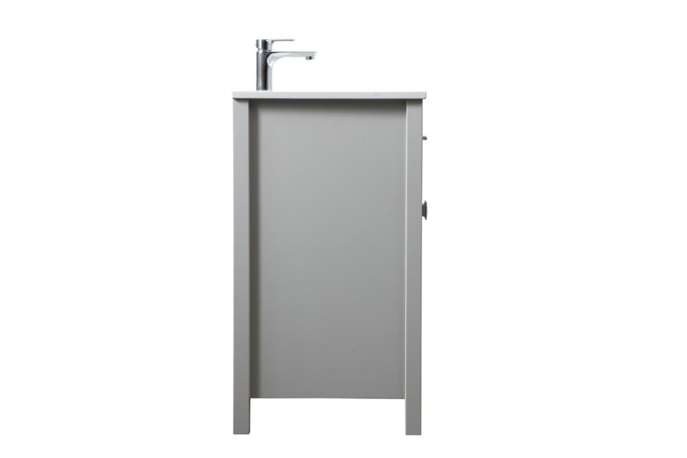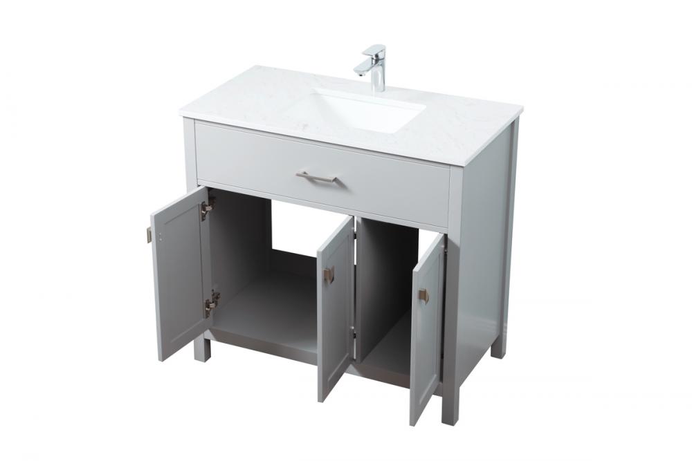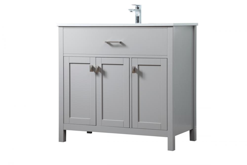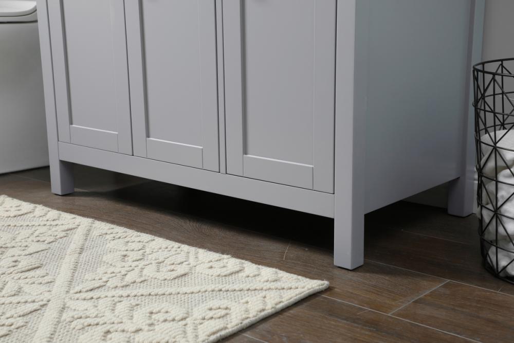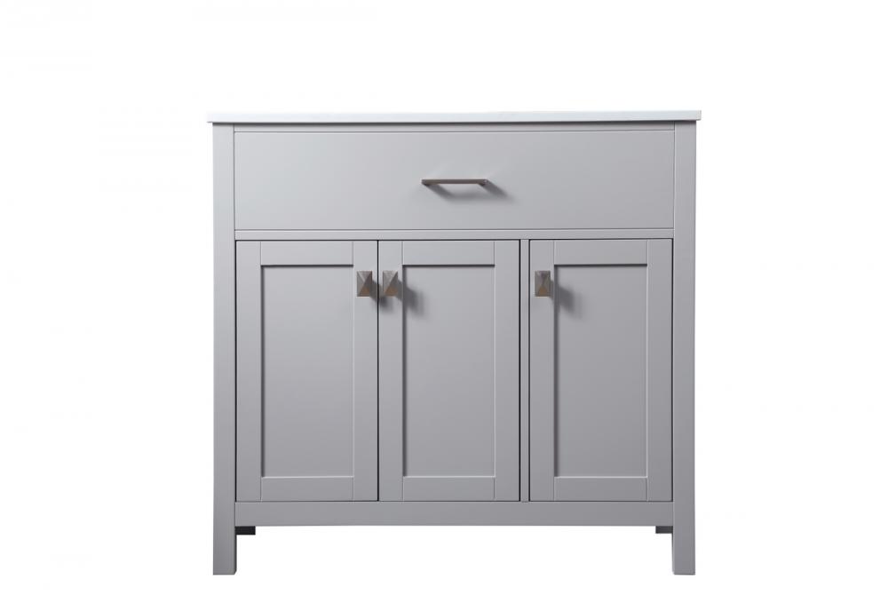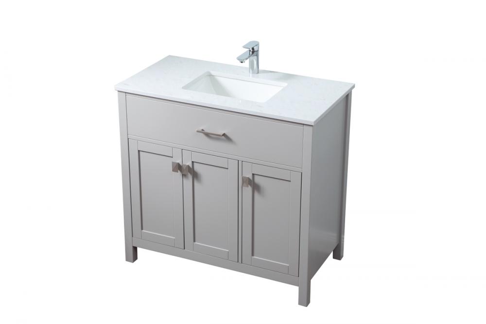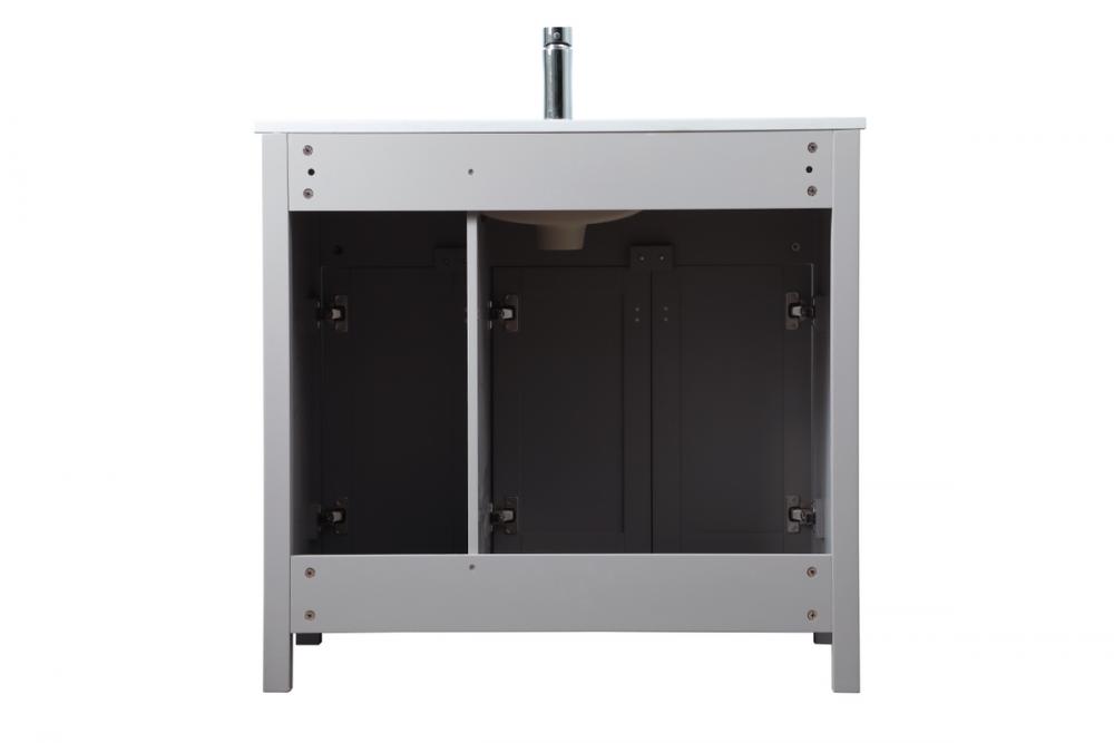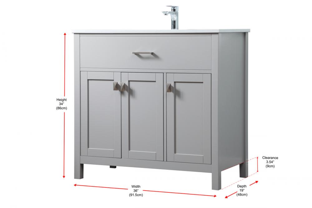 Elevate your bathroom aesthetic with our precision-crafted 36-inch vanity, featuring a chic straight edge cut and an engineered marble top that infuses a dash of modern elegance into your space. Designed for seamless access and ample storage, the vanity showcases two functional cabinets with soft close doors, paired with a faux top drawer. The sophisticated undermount porcelain sink seamlessly merges style with practicality, while the inclusion of stylish hardware adds a personalized touch and ensures convenient access to storage. Boasting a lower open shelf for additional storage, this vanity seamlessly blends functionality with style, providing a practical area for decor or essentials. Complete with a single pre-drilled hole for seamless faucet installation, our versatile vanity allows you to effortlessly personalize your bathroom, adding a final touch of elegance to your unique space. Redefine your bathroom experience with this stylish and functional addition.