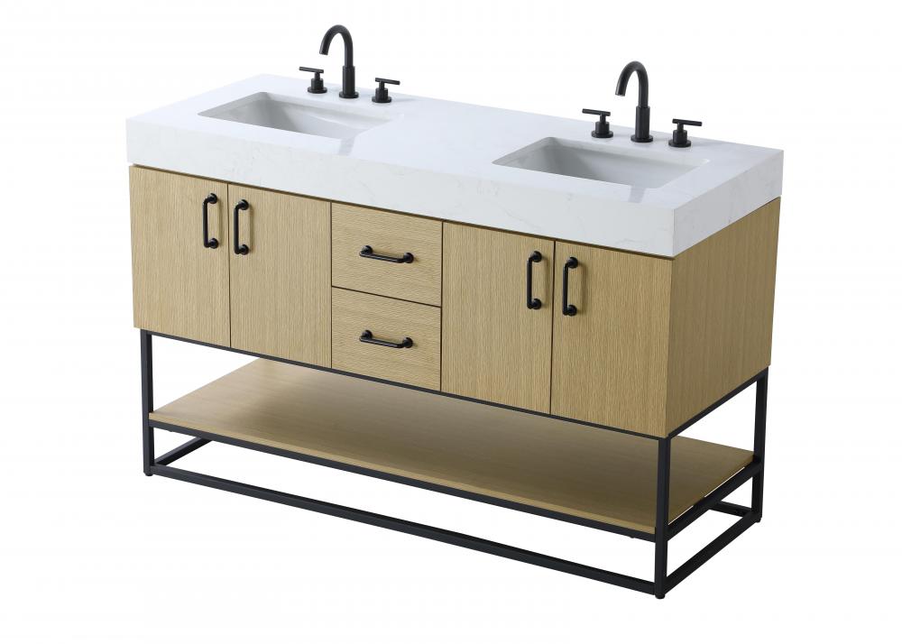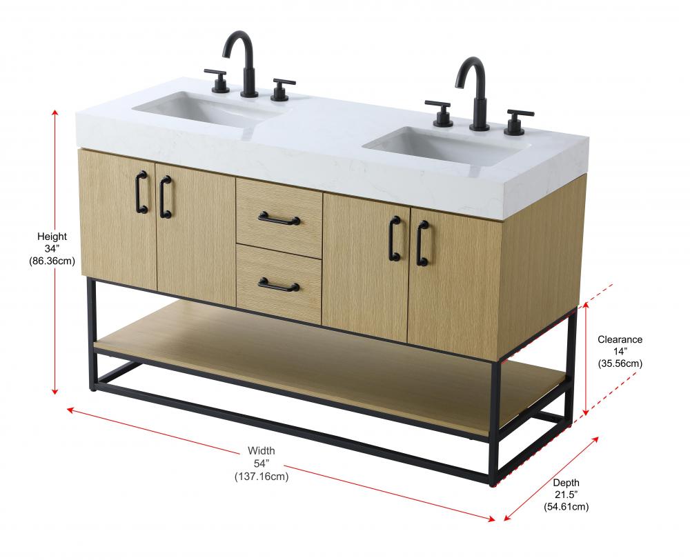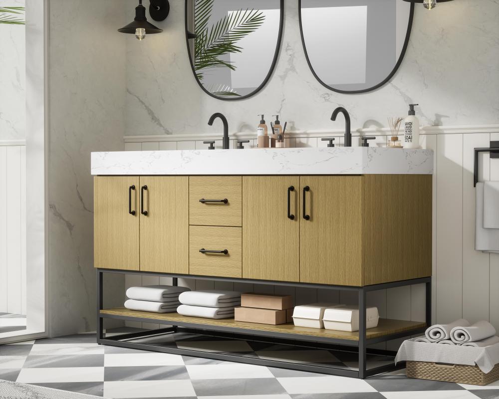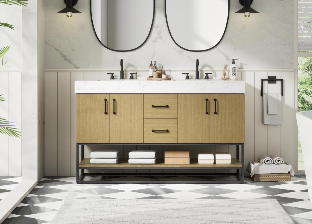 Upgrade your bathroom with this stylish transitional vanity, available in five stunning finishes, from crisp white to warm honey brown, designed to suit a variety of decor styles. The minimalist flat door panels and open wood shelf create a functional yet visually appealing storage solution, while the slender black metal legs elevate the look with modern sophistication. The 4-inch thick white engineered marble countertop, accented with natural veining, adds a luxurious touch, perfectly complemented by soft-closing doors with sleek black metal bar pulls. Thoughtful details like the concealed overflow, back panel cutout for plumbing, and 3 pre-drilled holes for an 8-inch faucet make installation easy and efficient. with a porcelain sink and farmhouse-inspired touches, this vanity brings both elegance and practicality to any bathroom setting.