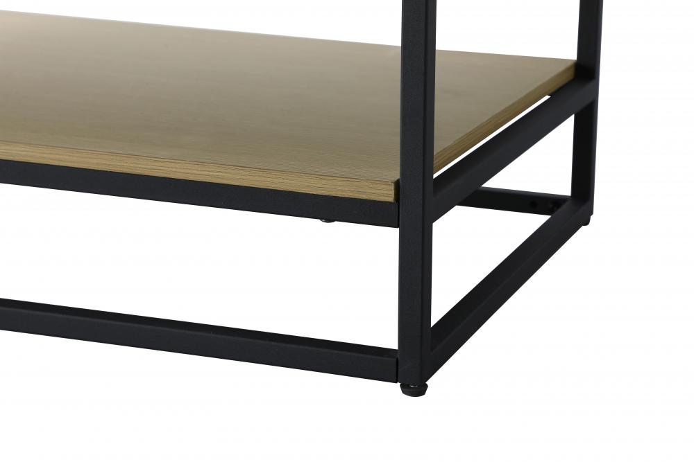 A matching open wood shelf at the bottom provides ample space for storage and decor, supported by slender black metal legs with a 14-inch clearance, combining both practical function and a contemporary edge.