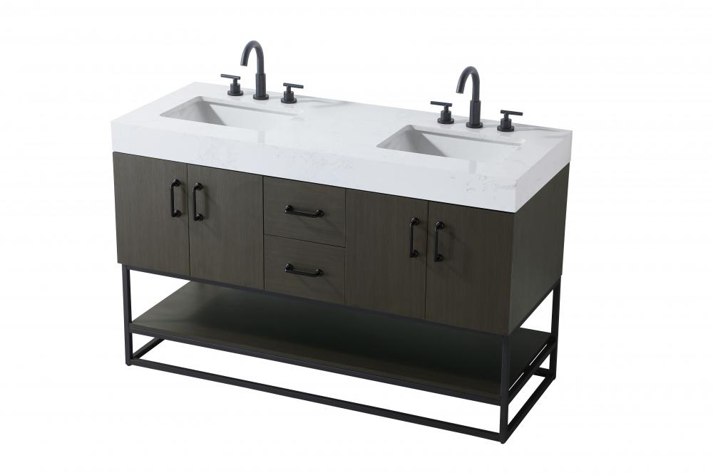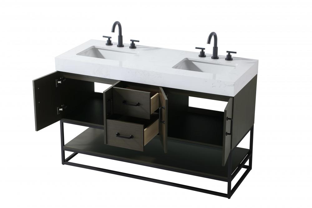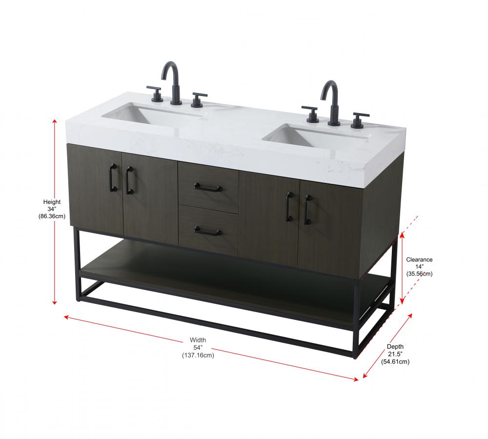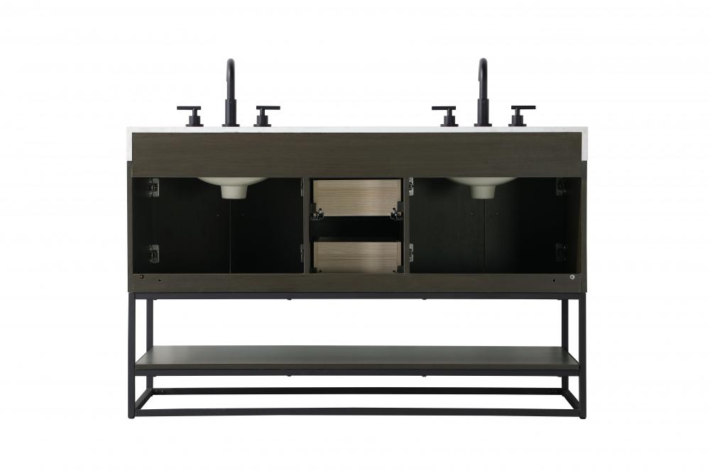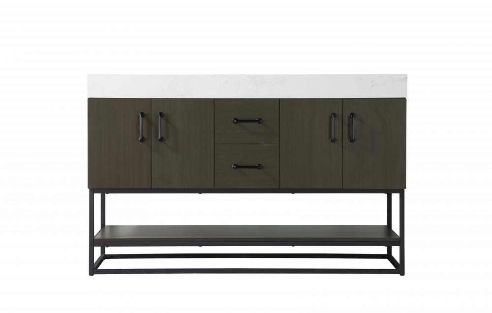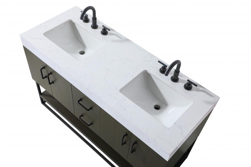 Upgrade your bathroom with this stylish transitional vanity, available in five stunning finishes, from crisp white to warm honey brown, designed to suit a variety of decor styles. The minimalist flat door panels and open wood shelf create a functional yet visually appealing storage solution, while the slender black metal legs elevate the look with modern sophistication. The 4-inch thick white engineered marble countertop, accented with natural veining, adds a luxurious touch, perfectly complemented by soft-closing doors with sleek black metal bar pulls. Thoughtful details like the concealed overflow, back panel cutout for plumbing, and 3 pre-drilled holes for an 8-inch faucet make installation easy and efficient. with a porcelain sink and farmhouse-inspired touches, this vanity brings both elegance and practicality to any bathroom setting.
