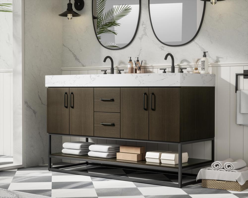 This transitional bathroom vanity is available in five curated finishes to suit any style: Crisp White for timeless elegance, Sleek Grey for a modern touch, Mocha Brown for a rich, luxurious feel.