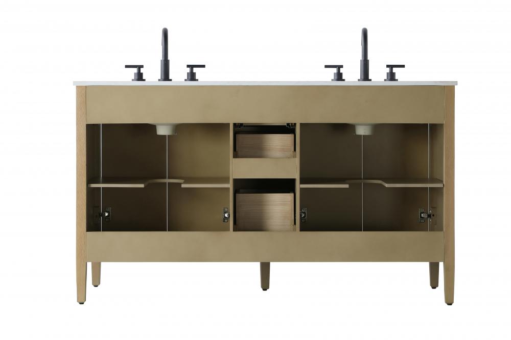 The vanity is topped with a stunning white engineered marble countertop with natural veining that adds luxurious detail and durability.