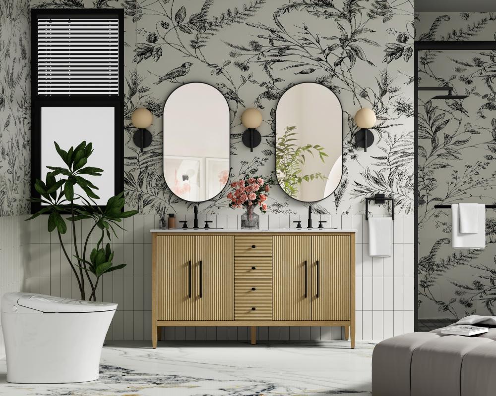 The slender black metal pulls on the doors and the oval-shaped knobs on the drawers provide sleek, modern accents, enhancing the vanity's elegant design.