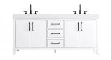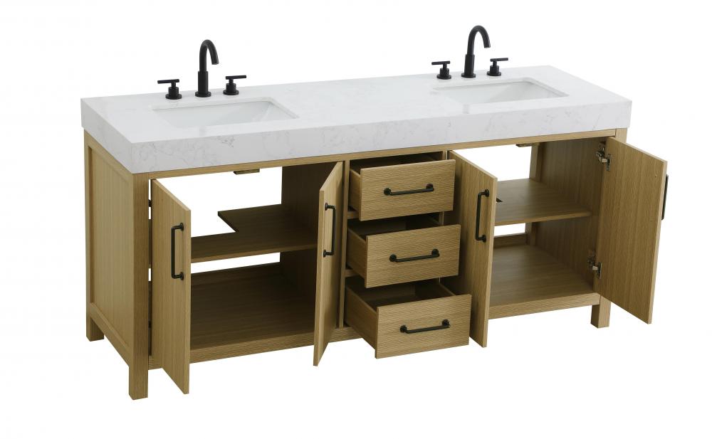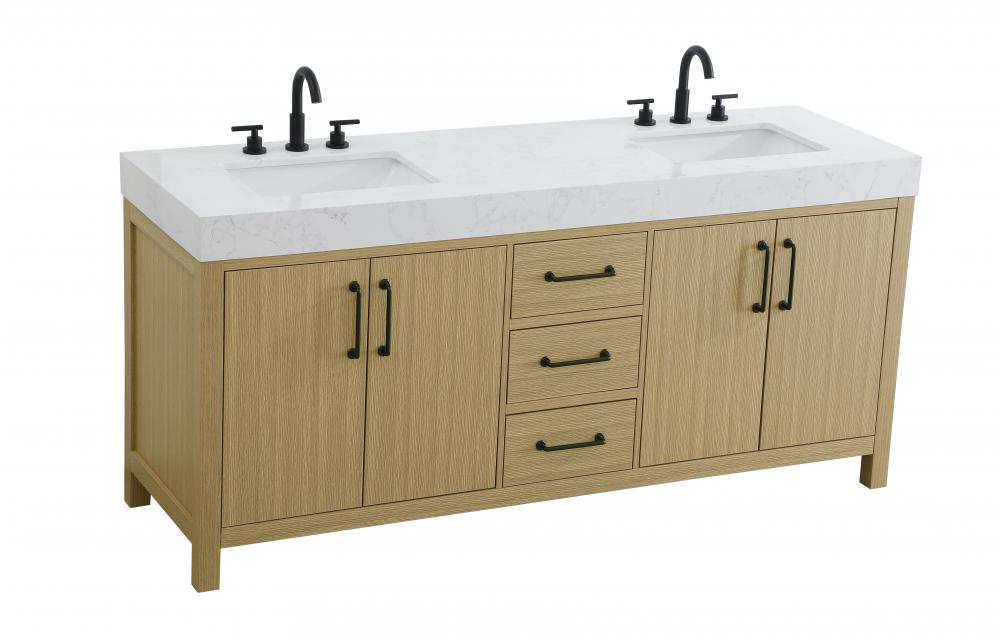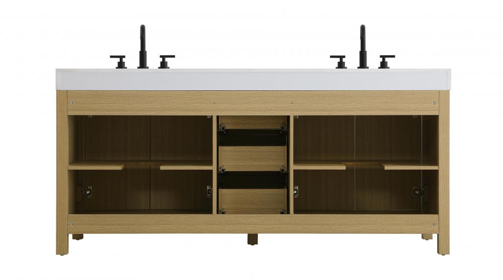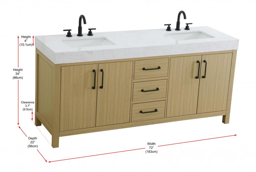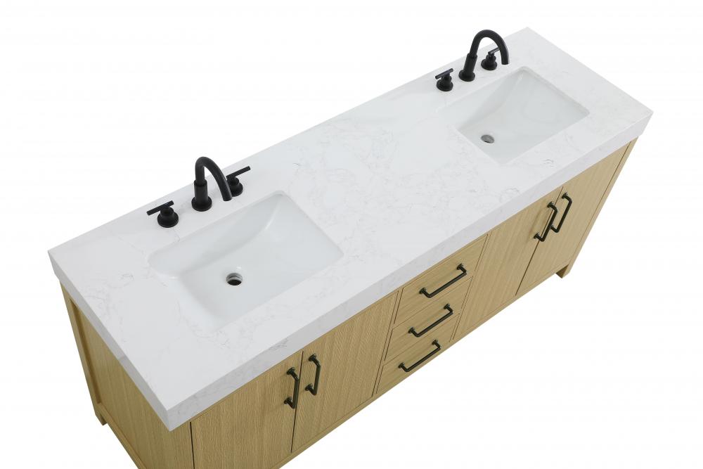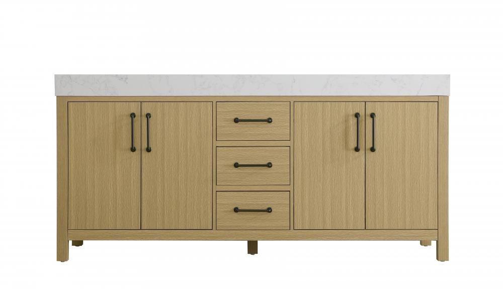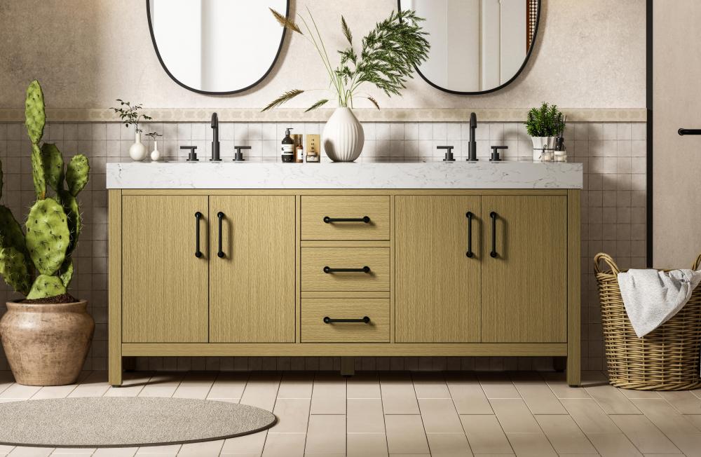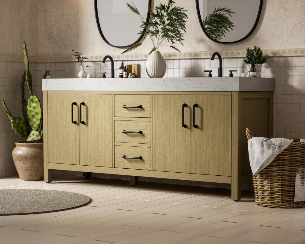 This bathroom vanity showcases a balanced blend of contemporary style and warm, natural-like elements, making it a versatile addition to various interior designs. The clean, straight edges and flat-panel doors lend a modern, streamlined look, while the soft, light wood finish highlights the faux grain pattern, adding warmth and a sense of organic texture to the piece. The design features a double-sink layout, emphasizing functionality and spaciousness, ideal for shared bathrooms. The central drawers and symmetrical cabinet doors create a sense of balance and structure. Matte black hardware offers a bold contrast to the light wood tone, reinforcing the modern aesthetic while maintaining a timeless appeal. The thick engineered marble countertop adds a sturdy, minimalist element, with its clean white surface further elevating the overall sophistication of the vanity. This piece is a perfect marriage of style and practicality, effortlessly complementing both modern and transitional bathroom designs. This vanity is delivered fully assembled and equipped with foot levelers for effortless installation and stability. Combining practicality and bold design, this vanity is UPC certified and ready to transform your bathroom space.