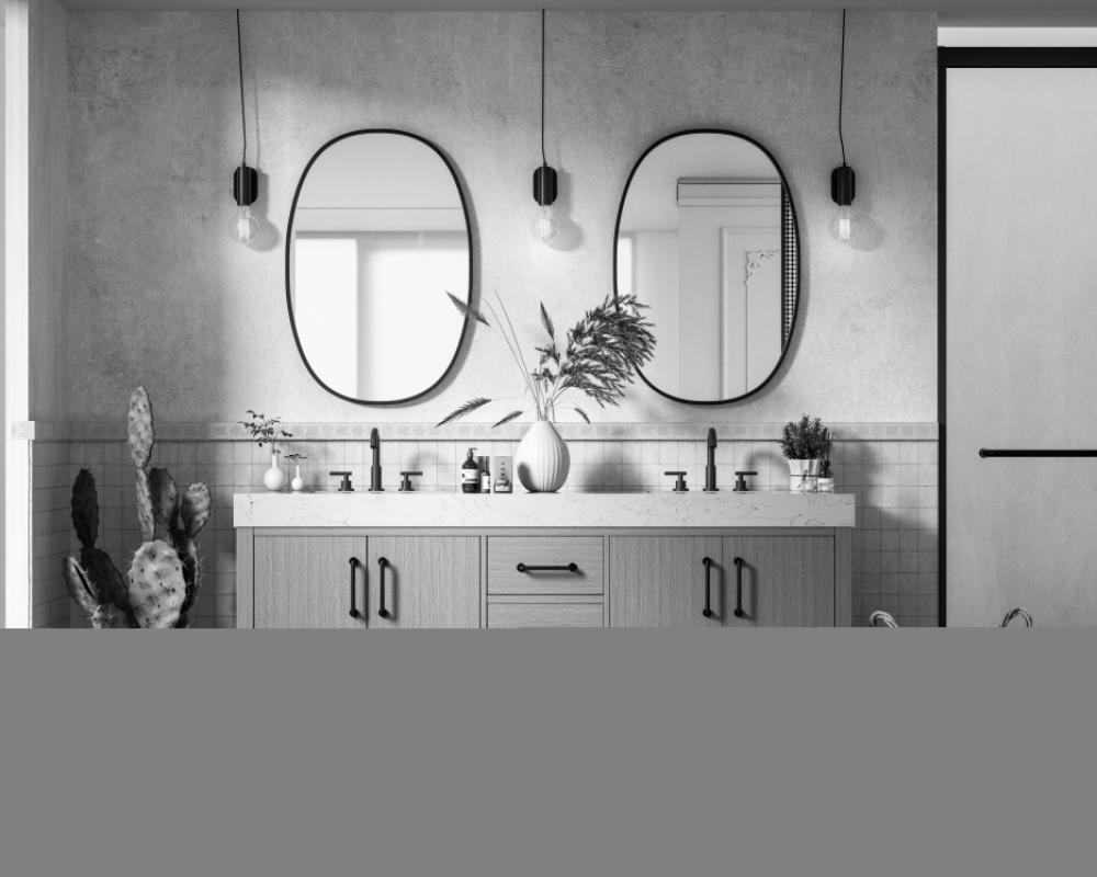 The door pulls are sleek, cylindrical handles in a matte black finish, providing a striking contrast to the warm wood tones of the vanity.