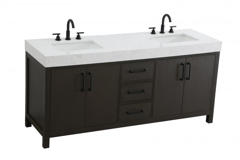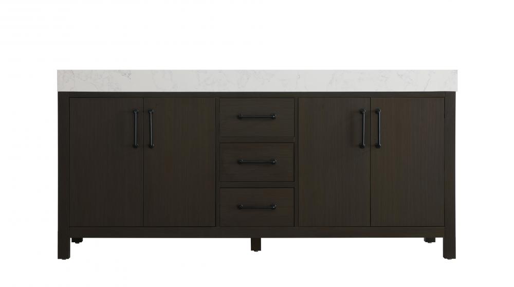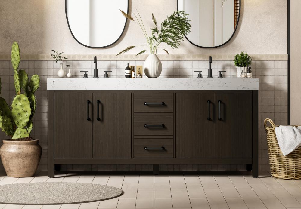 This bathroom vanity embodies a sleek, modern design with a strong, minimalist appeal. The deep mocha brown finish enhances the bold and sophisticated appearance, while the flat-panel doors and drawer fronts contribute to its clean, structured aesthetic. The wood's dark tone adds depth and richness, making it a striking focal point in any bathroom setting. The design features a double-sink layout, emphasizing functionality and spaciousness, ideal for shared bathrooms. The central drawers and symmetrical cabinet doors create a sense of balance and structure. Matte black hardware offers a bold contrast to the dark wood tone, reinforcing the modern aesthetic while maintaining a timeless appeal. The thick engineered marble countertop adds a sturdy, minimalist element, with its clean white surface further elevating the overall sophistication of the vanity. This piece is a perfect marriage of style and practicality, effortlessly complementing both modern and transitional bathroom designs. This vanity is delivered fully assembled and equipped with foot levelers for effortless installation and stability. Combining practicality and bold design, this vanity is UPC certified and ready to transform your bathroom space.