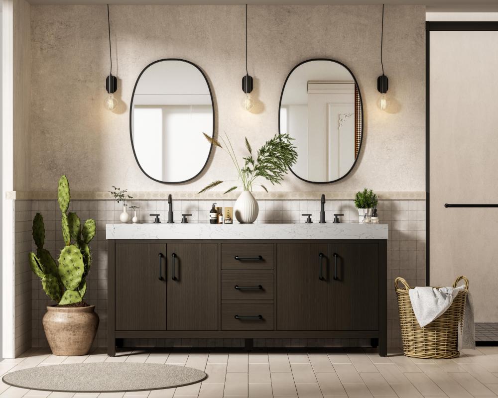 The door pulls are sleek, cylindrical handles in a matte black finish, providing a striking contrast to the warm wood tones of the vanity.