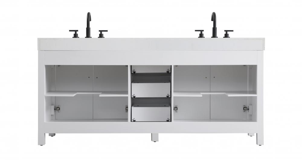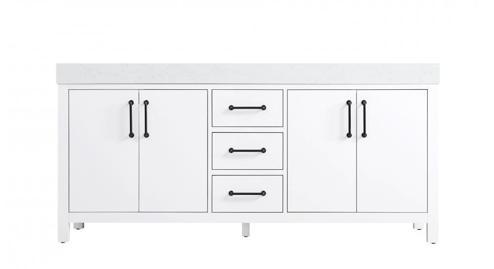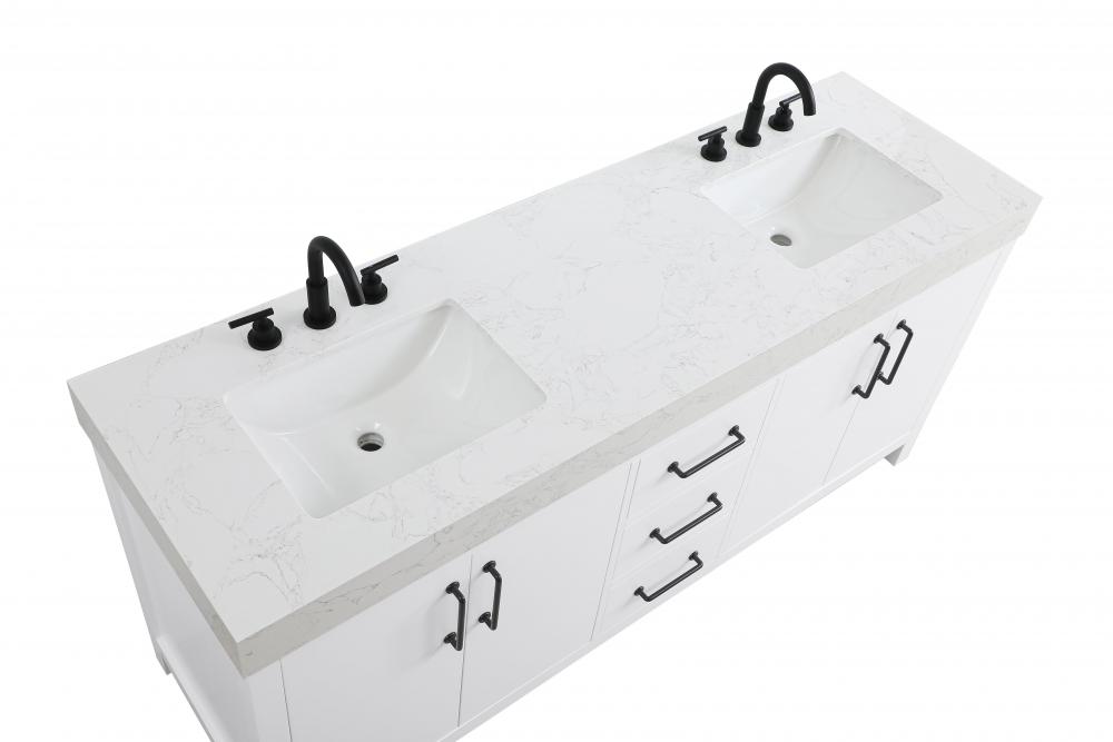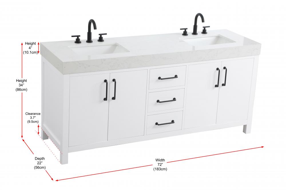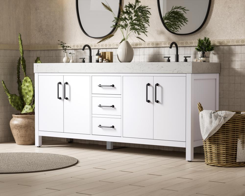This bathroom vanity offers a clean-lined design, perfect for modern and minimalistic spaces. The bright white finish enhances the overall brightness of the room, creating a fresh and airy feel. The design features a double-sink layout, emphasizing functionality and spaciousness, ideal for shared bathrooms. The central drawers and symmetrical cabinet doors create a sense of balance and structure. Matte black hardware offers a bold contrast to the white finish, reinforcing the modern aesthetic while maintaining a timeless appeal. The thick engineered marble countertop adds a sturdy, minimalist element, with its clean white surface further elevating the overall sophistication of the vanity. This piece is a perfect marriage of style and practicality, effortlessly complementing both modern and transitional bathroom designs. This vanity is delivered fully assembled and equipped with foot levelers for effortless installation and stability. Combining practicality and bold design, this vanity is UPC certified and ready to transform your bathroom space.