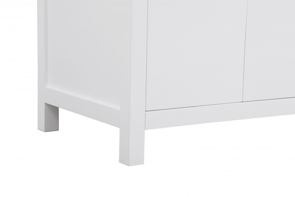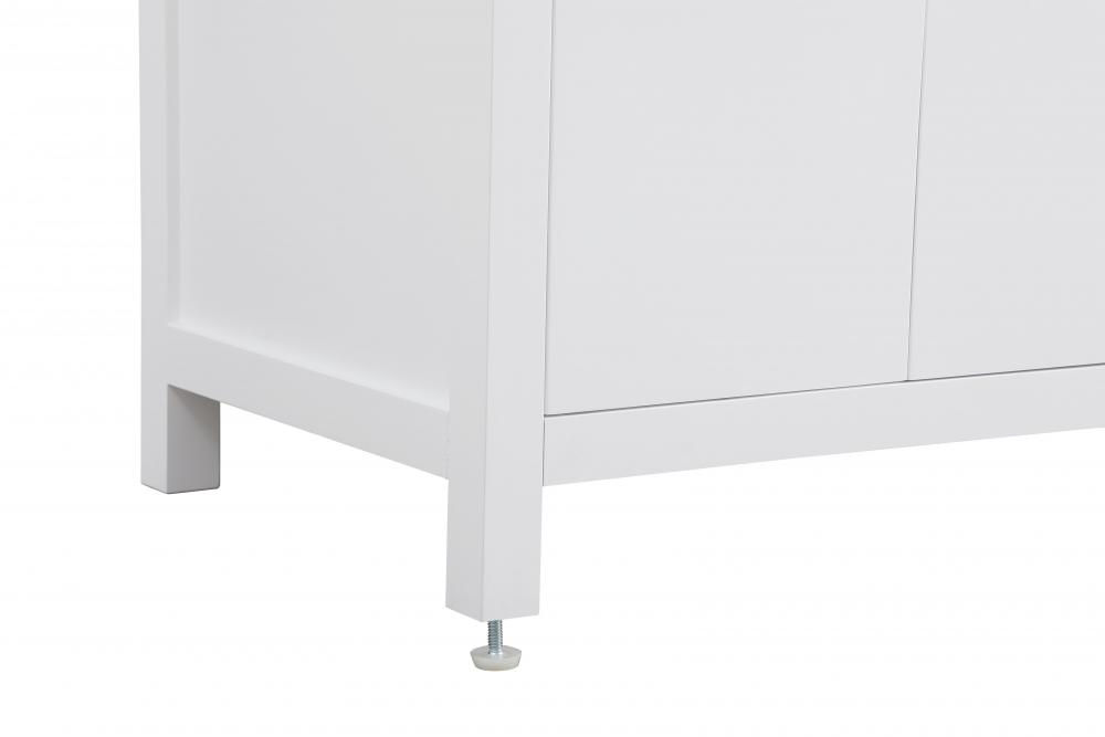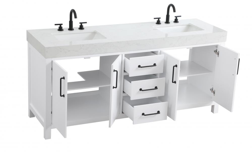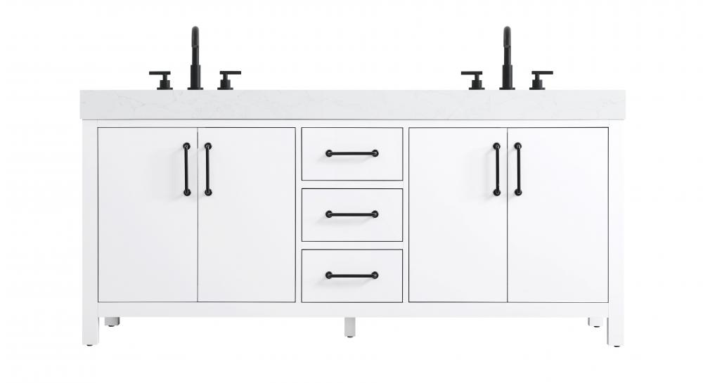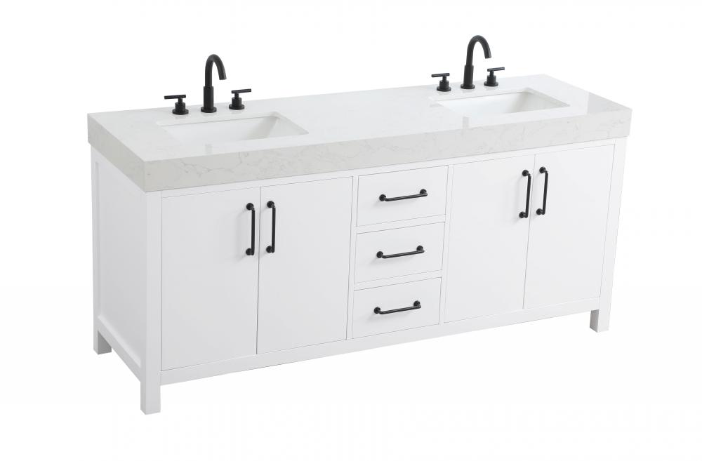 This bathroom vanity offers a clean-lined design, perfect for modern and minimalistic spaces. The bright white finish enhances the overall brightness of the room, creating a fresh and airy feel. The design features a double-sink layout, emphasizing functionality and spaciousness, ideal for shared bathrooms. The central drawers and symmetrical cabinet doors create a sense of balance and structure. Matte black hardware offers a bold contrast to the white finish, reinforcing the modern aesthetic while maintaining a timeless appeal. The thick engineered marble countertop adds a sturdy, minimalist element, with its clean white surface further elevating the overall sophistication of the vanity. This piece is a perfect marriage of style and practicality, effortlessly complementing both modern and transitional bathroom designs. This vanity is delivered fully assembled and equipped with foot levelers for effortless installation and stability. Combining practicality and bold design, this vanity is UPC certified and ready to transform your bathroom space.