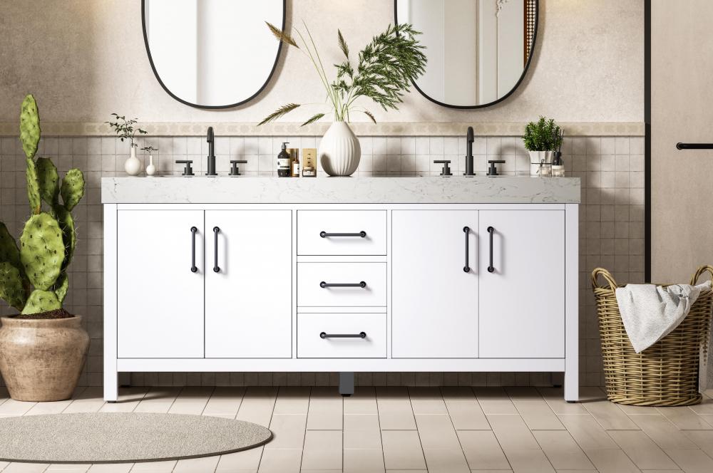 The door pulls are sleek, cylindrical handles in a matte black finish, providing a striking contrast to the white finish of the vanity.