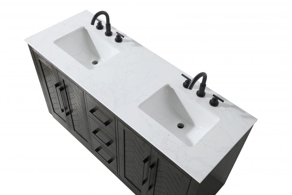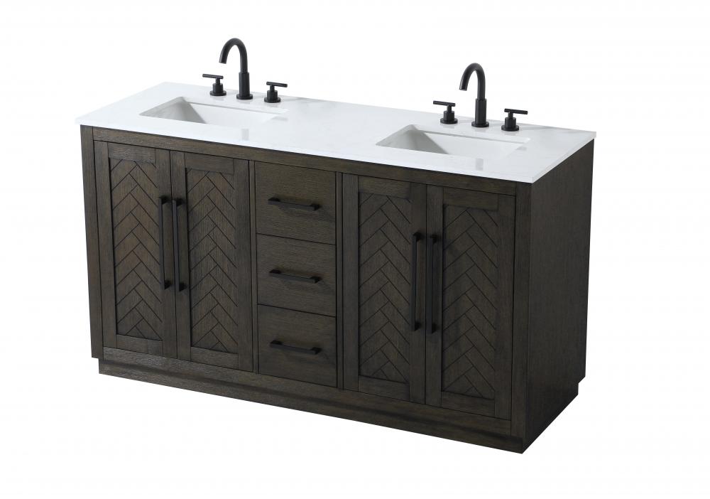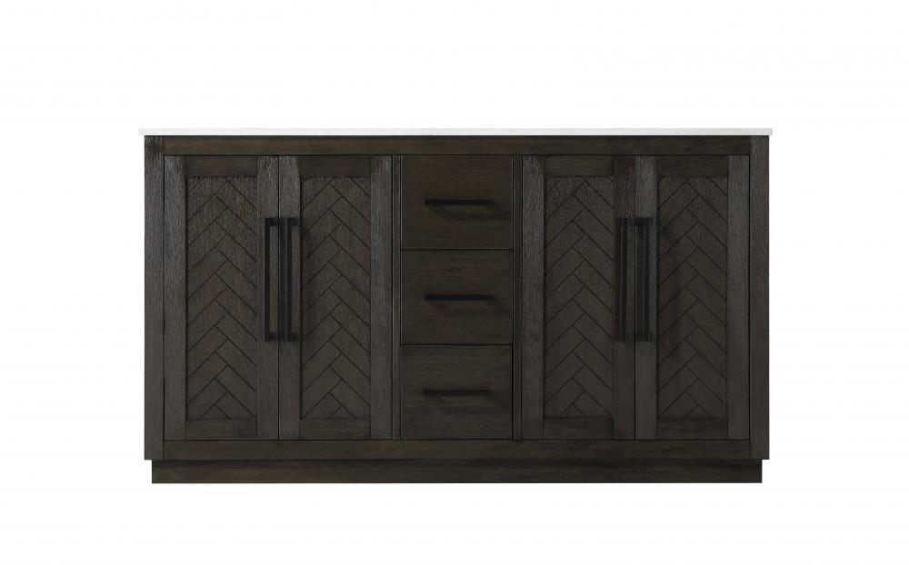 This transitional bathroom vanity offers the perfect blend of timeless style and modern functionality. Available in five refined finishes—crisp white, sleek grey, chocolate oak, honey oak, and linen oak—it complements a range of decor styles, from classic to contemporary. The stunning herringbone design on the Shaker-style door panels adds texture and craftsmanship to the piece. Topped with a white engineered marble countertop featuring subtle veining, it provides both beauty and durability. The long black metal pulls on the soft-closing doors and the thin bar pulls on the drawers add sleek, modern detailing. Practical features include a concealed overflow, a back panel cutout for easy plumbing installation, and a U-shaped cutout shelf to fit plumbing while maximizing storage space. with a toe kick all around the base, this vanity is thoughtfully designed to blend form and function in any bathroom setting.