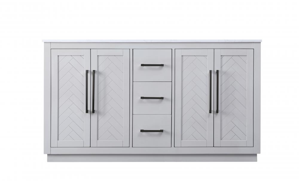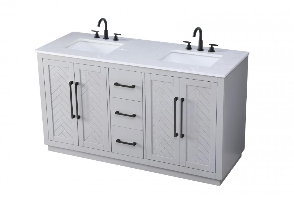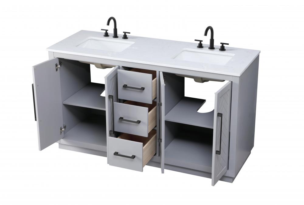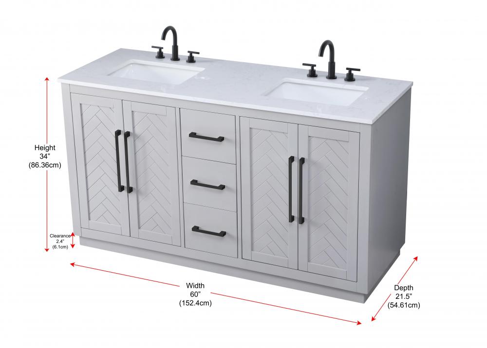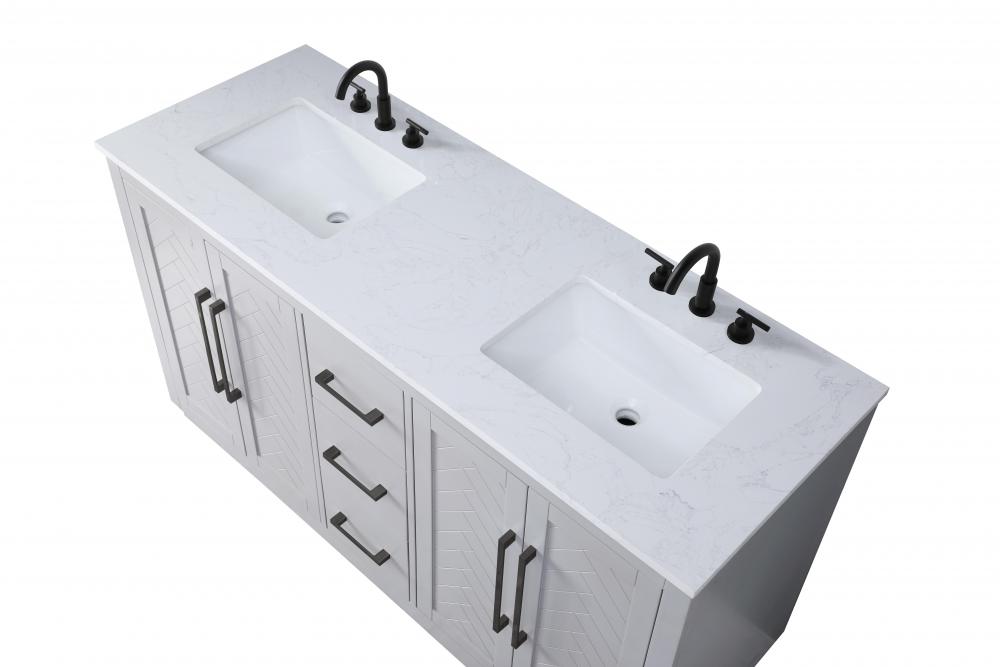 This transitional bathroom vanity offers the perfect blend of timeless style and modern functionality. Available in five refined finishes—crisp white, sleek grey, chocolate oak, honey oak, and linen oak—it complements a range of decor styles, from classic to contemporary. The stunning herringbone design on the Shaker-style door panels adds texture and craftsmanship to the piece. Topped with a white engineered marble countertop featuring subtle veining, it provides both beauty and durability. The long black metal pulls on the soft-closing doors and the thin bar pulls on the drawers add sleek, modern detailing. Practical features include a concealed overflow, a back panel cutout for easy plumbing installation, and a U-shaped cutout shelf to fit plumbing while maximizing storage space. with a toe kick all around the base, this vanity is thoughtfully designed to blend form and function in any bathroom setting.
