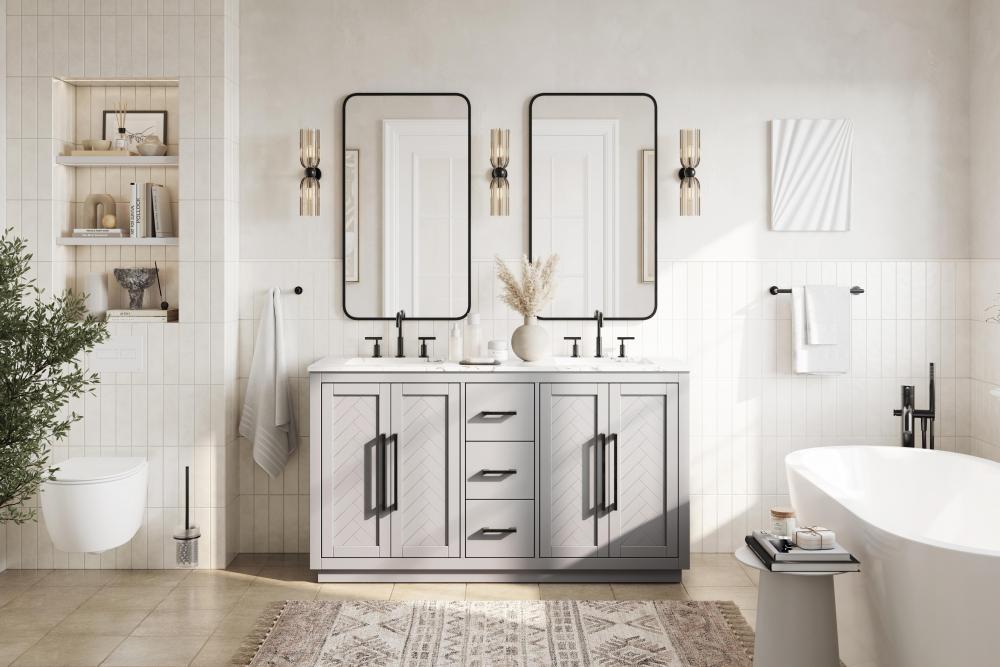 Each finish enhances the unique herringbone design on the Shaker-style door panels, adding a touch of craftsmanship and texture that elevates the overall design of the vanity.