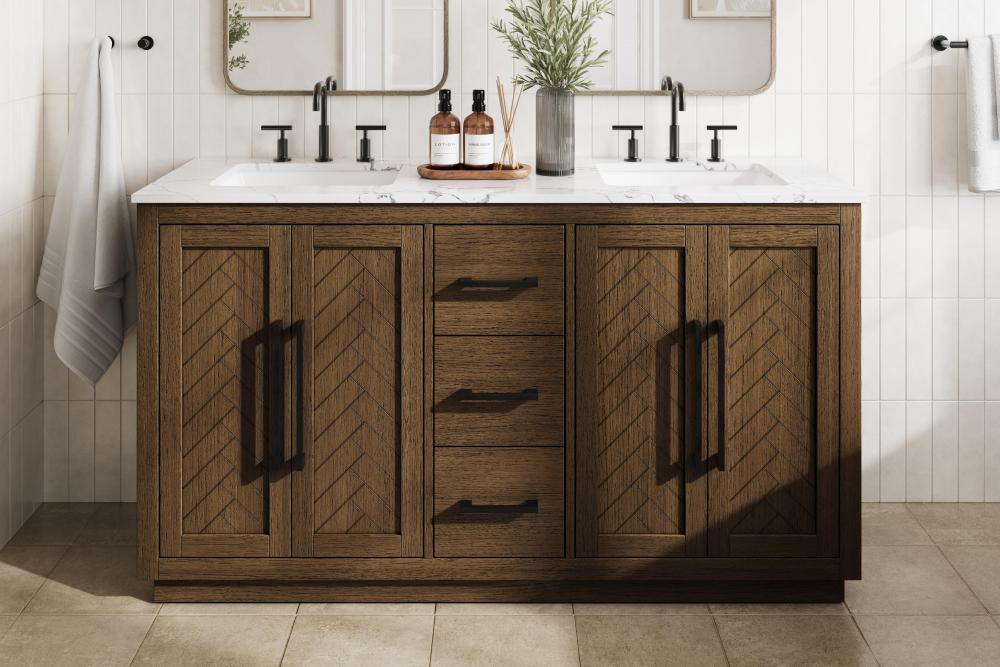 Each finish enhances the unique herringbone design on the Shaker-style door panels, adding a touch of craftsmanship and texture that elevates the overall design of the vanity.
