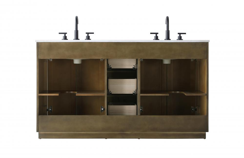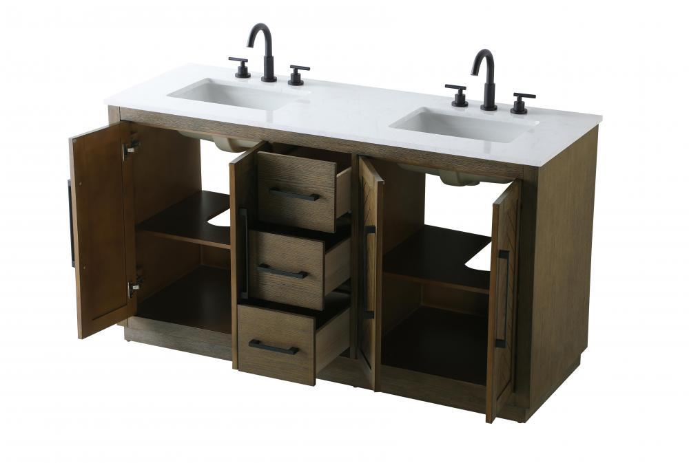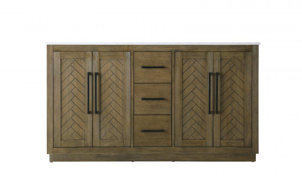 This transitional bathroom vanity offers the perfect blend of timeless style and modern functionality. Available in five refined finishes—crisp white, sleek grey, chocolate oak, honey oak, and linen oak—it complements a range of decor styles, from classic to contemporary. The stunning herringbone design on the Shaker-style door panels adds texture and craftsmanship to the piece. Topped with a white engineered marble countertop featuring subtle veining, it provides both beauty and durability. The long black metal pulls on the soft-closing doors and the thin bar pulls on the drawers add sleek, modern detailing. Practical features include a concealed overflow, a back panel cutout for easy plumbing installation, and a U-shaped cutout shelf to fit plumbing while maximizing storage space. with a toe kick all around the base, this vanity is thoughtfully designed to blend form and function in any bathroom setting.