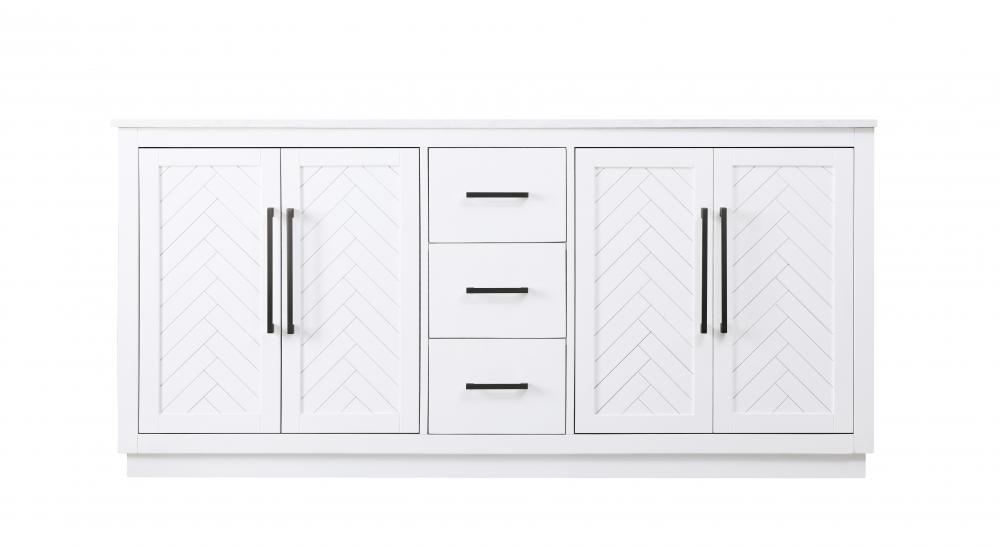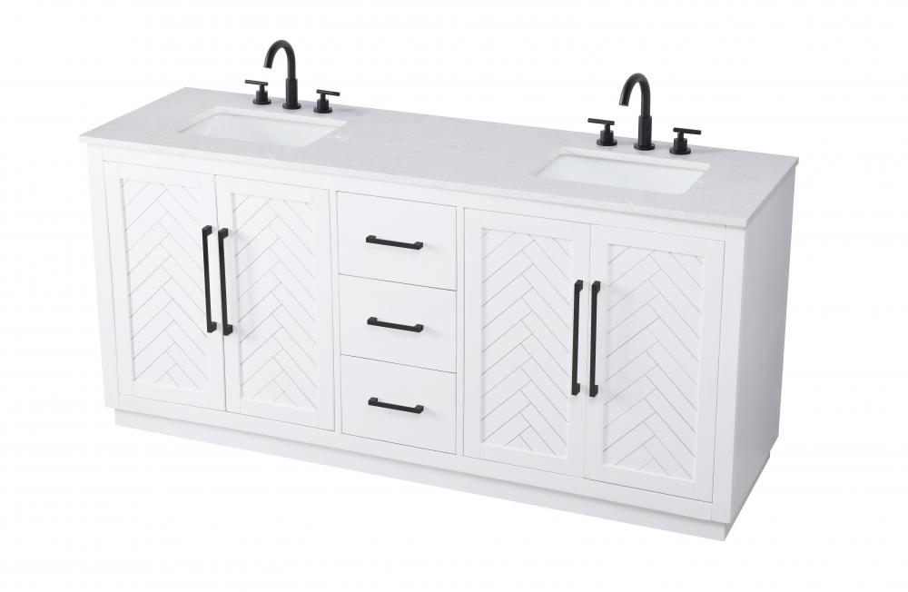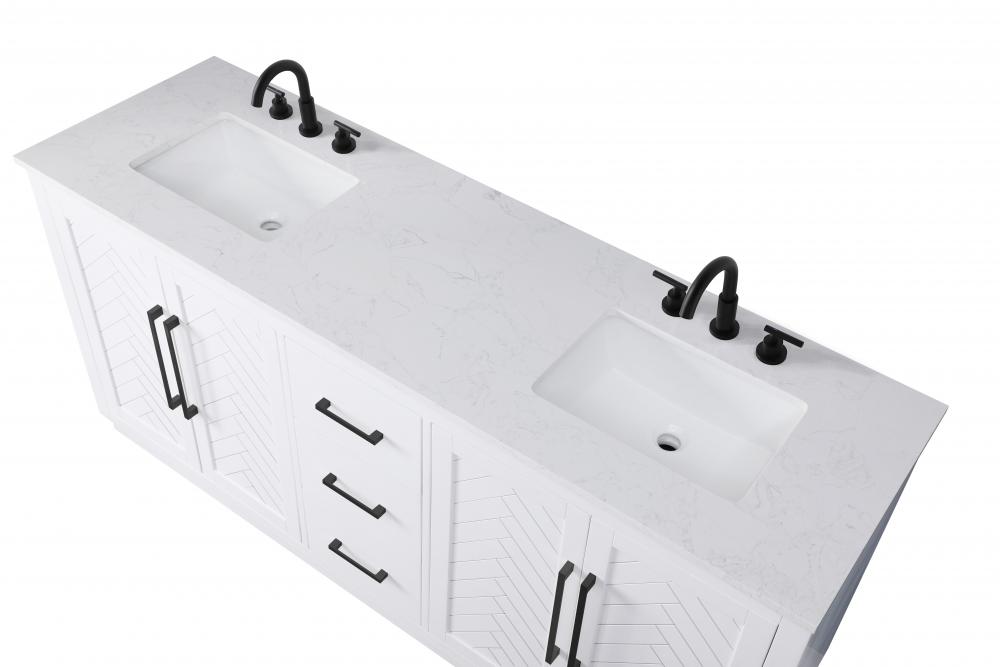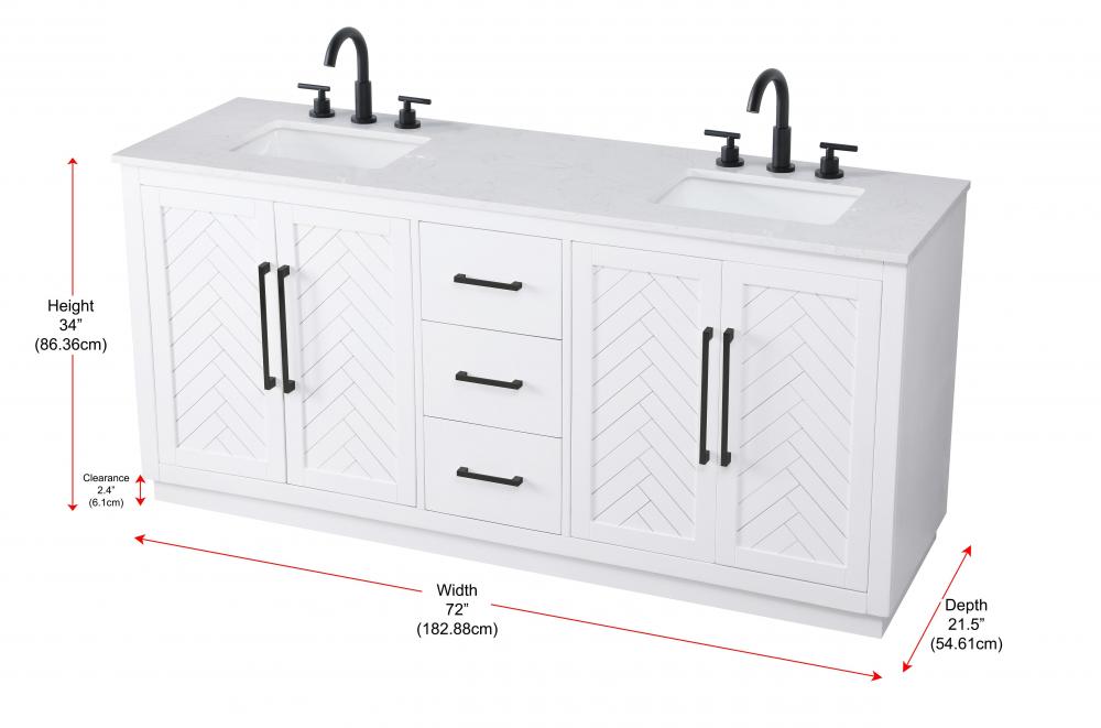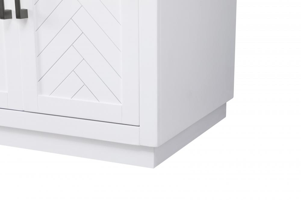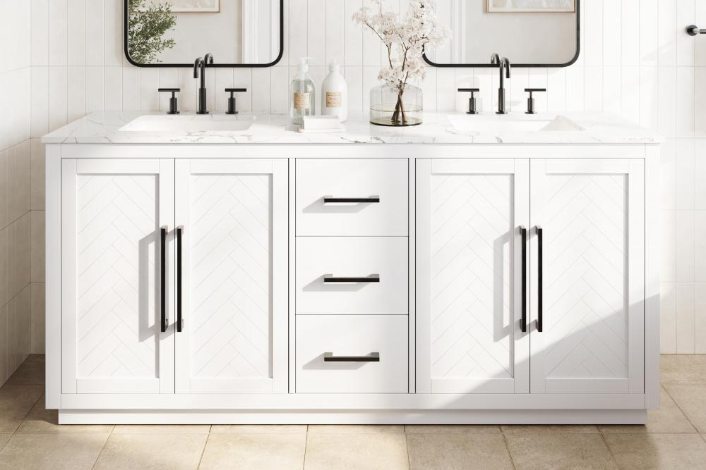 This transitional bathroom vanity offers the perfect blend of timeless style and modern functionality. Available in five refined finishes—crisp white, sleek grey, chocolate oak, honey oak, and linen oak—it complements a range of decor styles, from classic to contemporary. The stunning herringbone design on the Shaker-style door panels adds texture and craftsmanship to the piece. Topped with a white engineered marble countertop featuring subtle veining, it provides both beauty and durability. The long black metal pulls on the soft-closing doors and the thin bar pulls on the drawers add sleek, modern detailing. Practical features include a concealed overflow, a back panel cutout for easy plumbing installation, and a U-shaped cutout shelf to fit plumbing while maximizing storage space. with a toe kick all around the base, this vanity is thoughtfully designed to blend form and function in any bathroom setting.