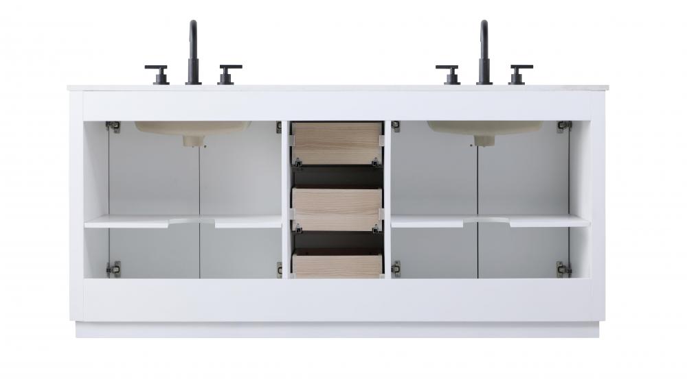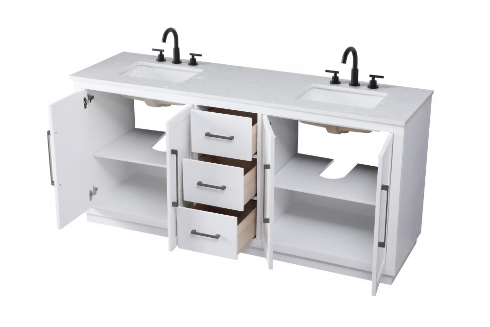 The vanity is topped with a white engineered marble countertop featuring subtle, natural-looking veining that creates a luxurious yet low-maintenance surface. This countertop adds elegance while providing durability, making it ideal for everyday use.