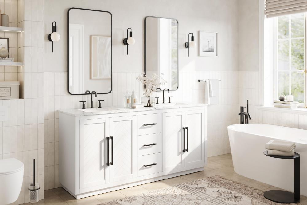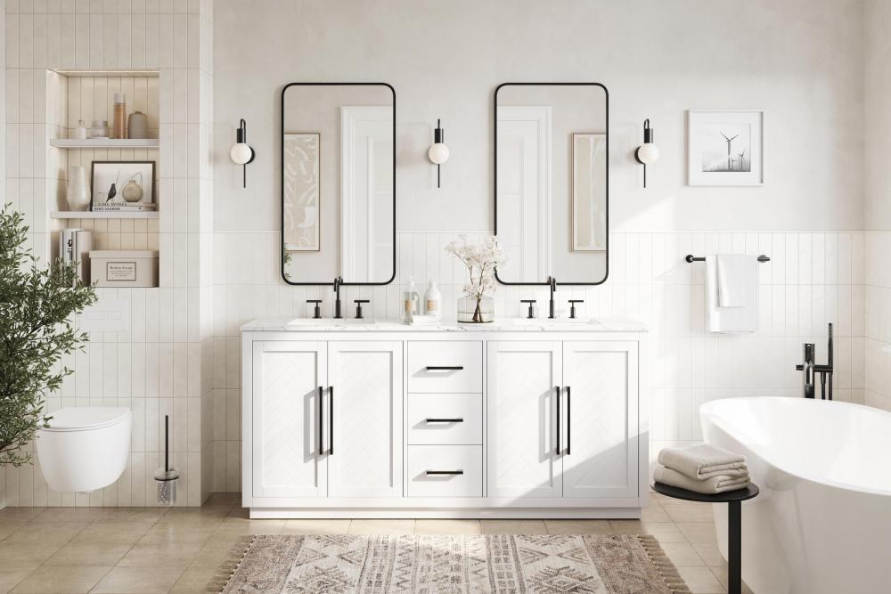 Each finish enhances the unique herringbone design on the Shaker-style door panels, adding a touch of craftsmanship and texture that elevates the overall design of the vanity.