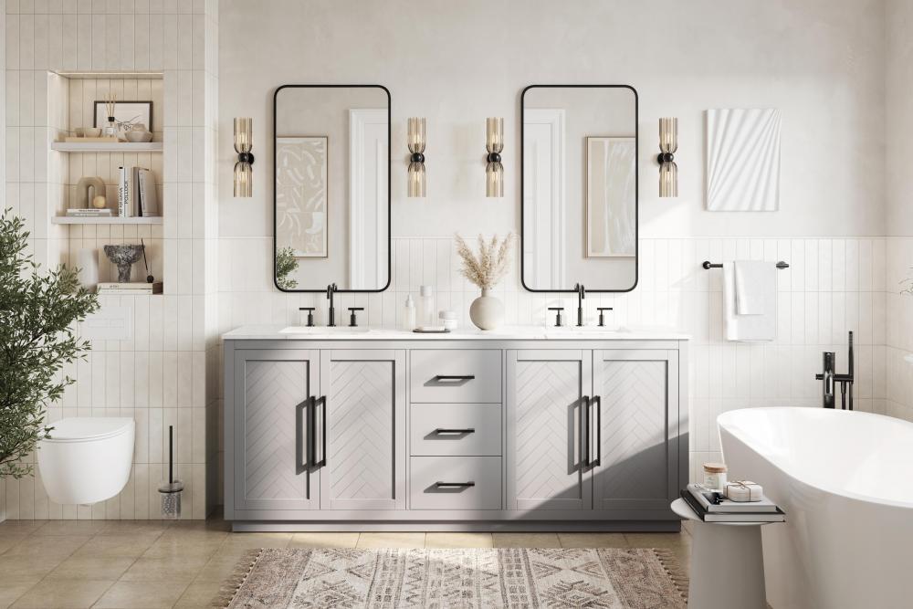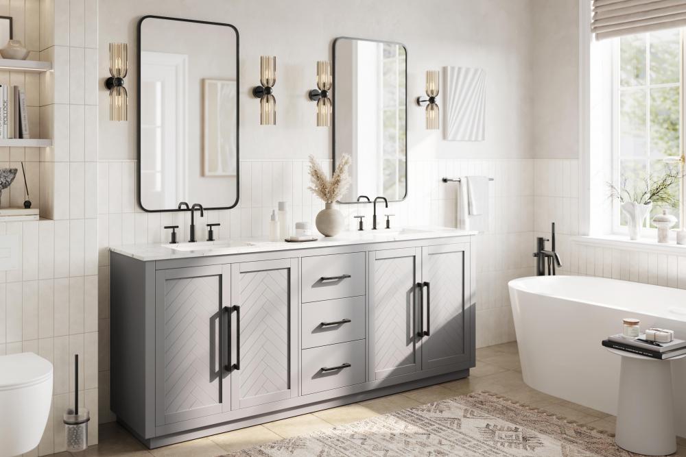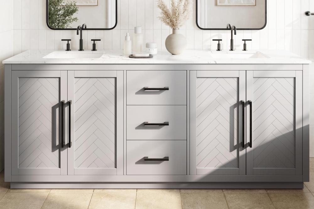 Each finish enhances the unique herringbone design on the Shaker-style door panels, adding a touch of craftsmanship and texture that elevates the overall design of the vanity.