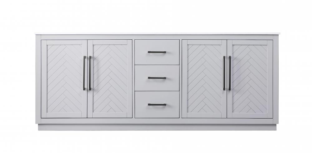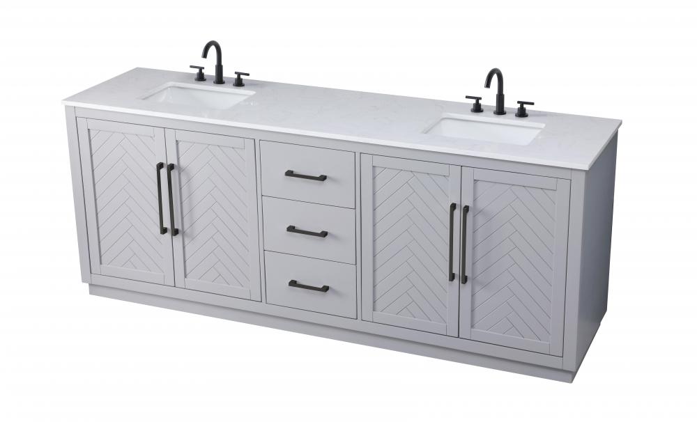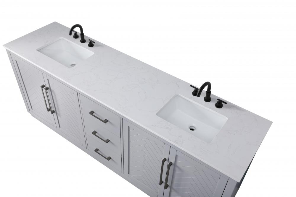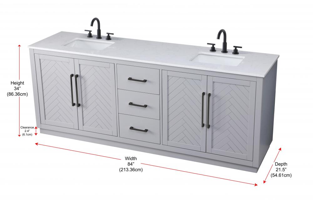 This transitional bathroom vanity offers the perfect blend of timeless style and modern functionality. Available in five refined finishes—crisp white, sleek grey, chocolate oak, honey oak, and linen oak—it complements a range of decor styles, from classic to contemporary. The stunning herringbone design on the Shaker-style door panels adds texture and craftsmanship to the piece. Topped with a white engineered marble countertop featuring subtle veining, it provides both beauty and durability. The long black metal pulls on the soft-closing doors and the thin bar pulls on the drawers add sleek, modern detailing. Practical features include a concealed overflow, a back panel cutout for easy plumbing installation, and a U-shaped cutout shelf to fit plumbing while maximizing storage space. with a toe kick all around the base, this vanity is thoughtfully designed to blend form and function in any bathroom setting.