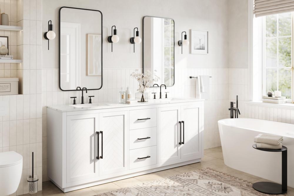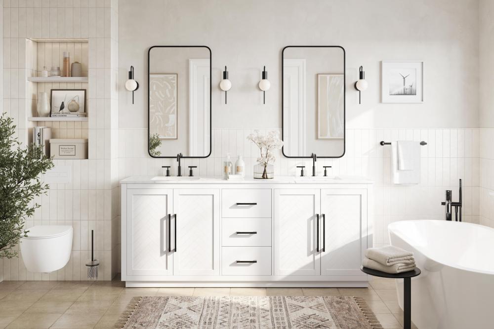 Each finish enhances the unique herringbone design on the Shaker-style door panels, adding a touch of craftsmanship and texture that elevates the overall design of the vanity.