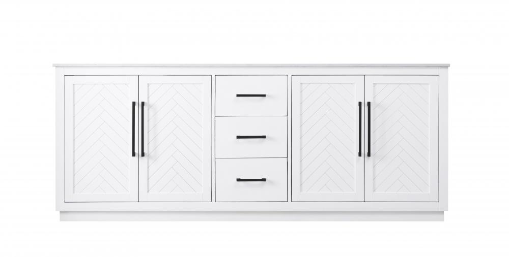 This transitional bathroom vanity offers the perfect blend of timeless style and modern functionality. Available in five refined finishes—crisp white, sleek grey, chocolate oak, honey oak, and linen oak—it complements a range of decor styles, from classic to contemporary. The stunning herringbone design on the Shaker-style door panels adds texture and craftsmanship to the piece. Topped with a white engineered marble countertop featuring subtle veining, it provides both beauty and durability. The long black metal pulls on the soft-closing doors and the thin bar pulls on the drawers add sleek, modern detailing. Practical features include a concealed overflow, a back panel cutout for easy plumbing installation, and a U-shaped cutout shelf to fit plumbing while maximizing storage space. with a toe kick all around the base, this vanity is thoughtfully designed to blend form and function in any bathroom setting.