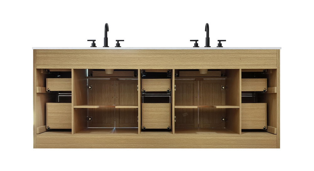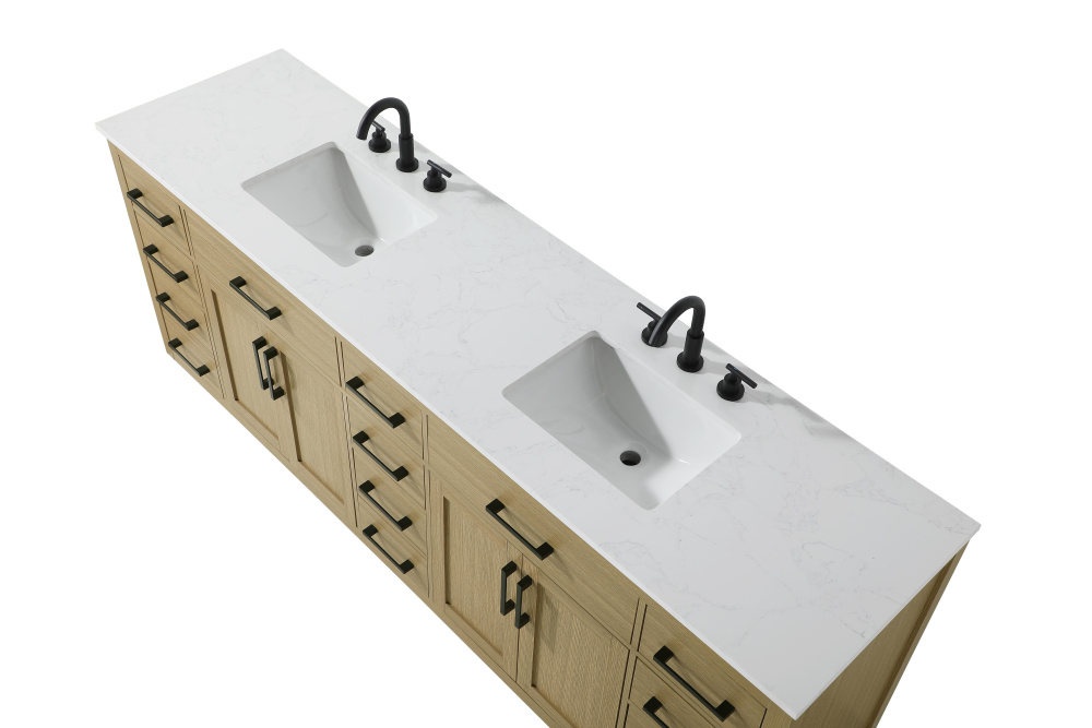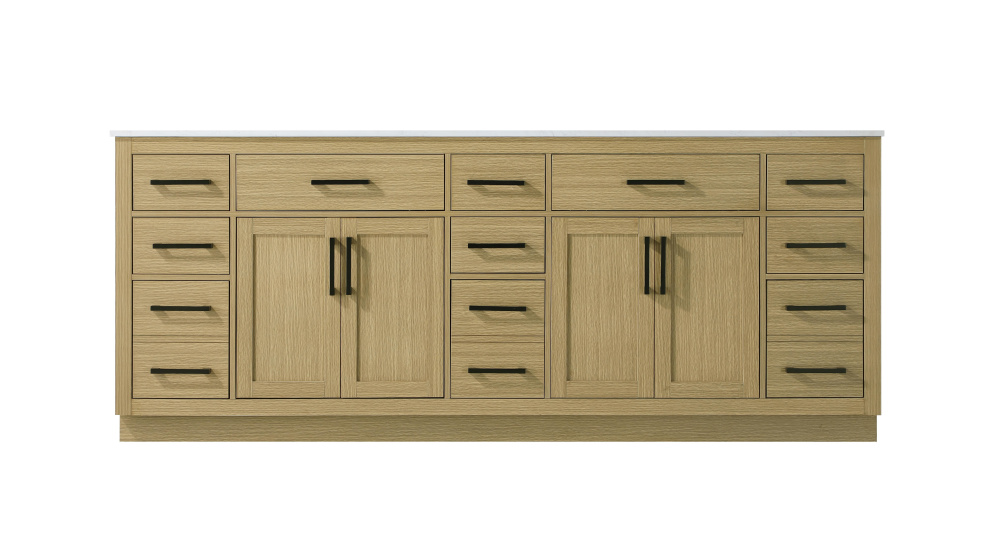 Introduce a perfect balance of functionality and style to your bathroom with this thoughtfully designed vanity. Constructed with a combination of solid wood and MDF, it offers durability and a sturdy build. The sleek engineered marble countertop with subtle grey marbling complements the rustic wood grain finish, creating a stylish and inviting centerpiece for your bathroom. Designed in a contemporary style with a transitional flair, it features a U-shaped shelf for seamless plumbing integration and multiple soft-close drawers for clutter-free organization. A pull-down drawer enhances convenience, while the toe kick adds a refined, clean-lined appearance and simplifies cleaning underneath. Matte black hardware contrasts beautifully with the cabinet finish, tying the look together. Delivered fully assembled and equipped with foot levelers, this vanity combines practicality and aesthetic appeal to suit modern and transitional bathrooms alike.