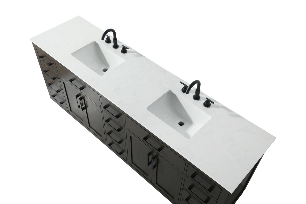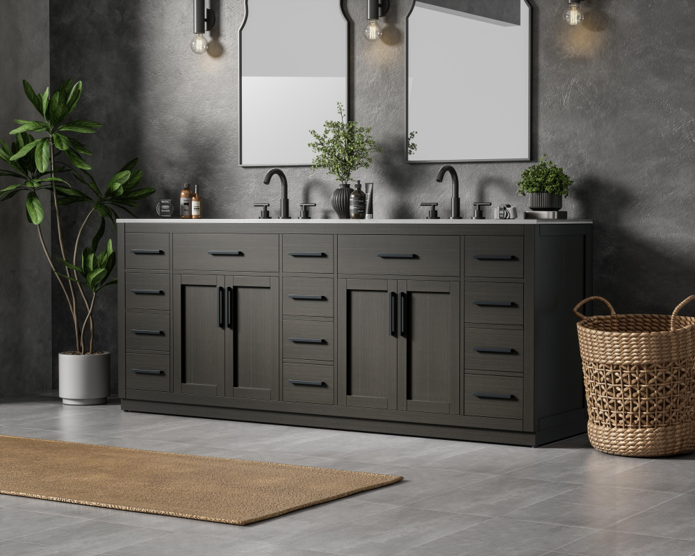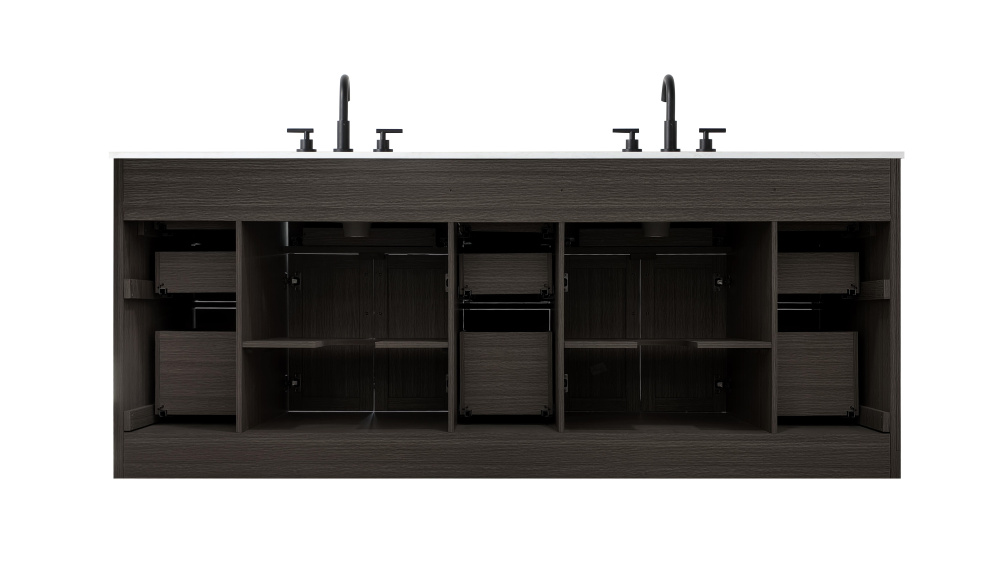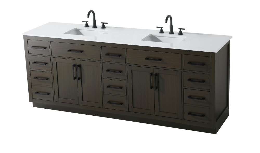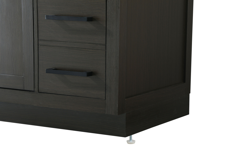 Introduce a perfect balance of functionality and style to your bathroom with this thoughtfully designed vanity. Constructed with a combination of solid wood and MDF, it offers durability and a sturdy build. The sleek engineered marble countertop with subtle grey marbling complements the rustic wood grain finish, creating a stylish and inviting centerpiece for your bathroom. Designed in a contemporary style with a transitional flair, it features a U-shaped shelf for seamless plumbing integration and multiple soft-close drawers for clutter-free organization. A pull-down drawer enhances convenience, while the toe kick adds a refined, clean-lined appearance and simplifies cleaning underneath. Matte black hardware contrasts beautifully with the cabinet finish, tying the look together. Delivered fully assembled and equipped with foot levelers, this vanity combines practicality and aesthetic appeal to suit modern and transitional bathrooms alike.
