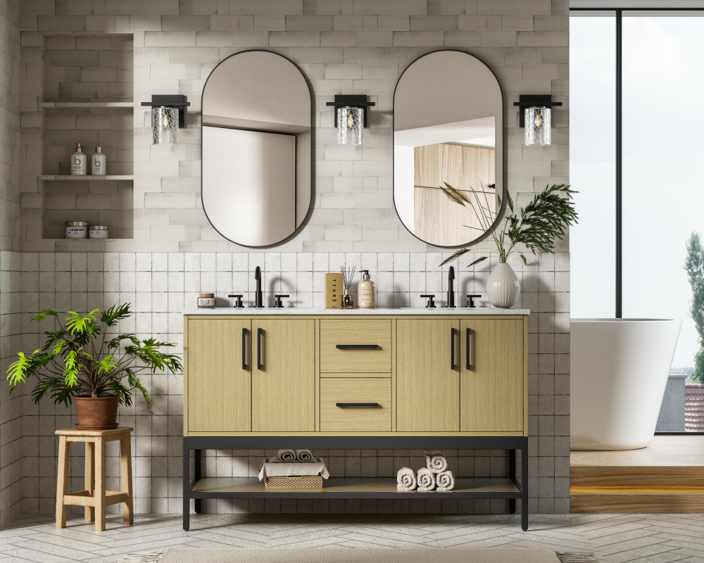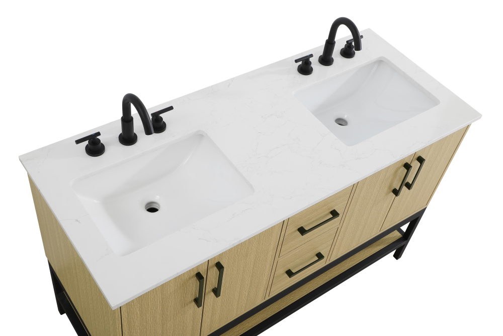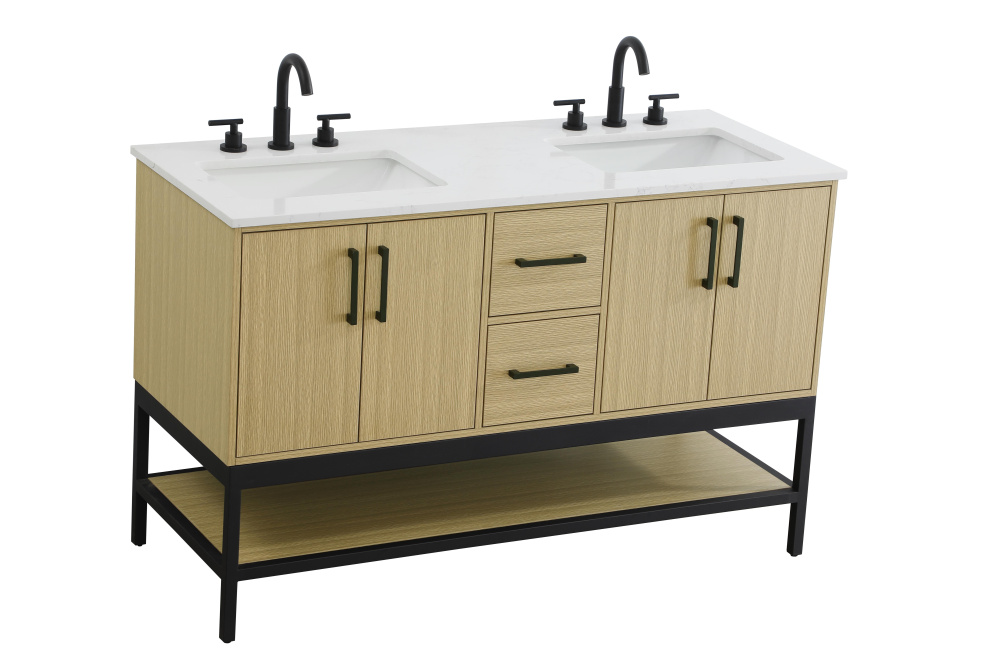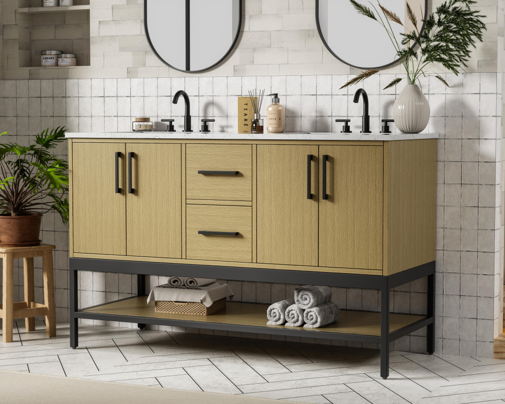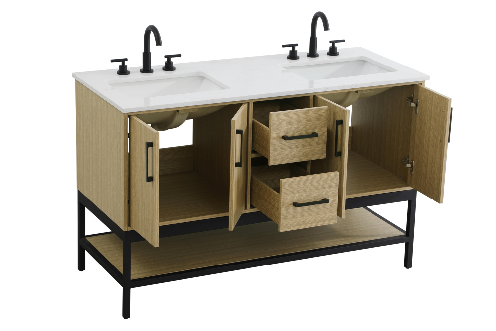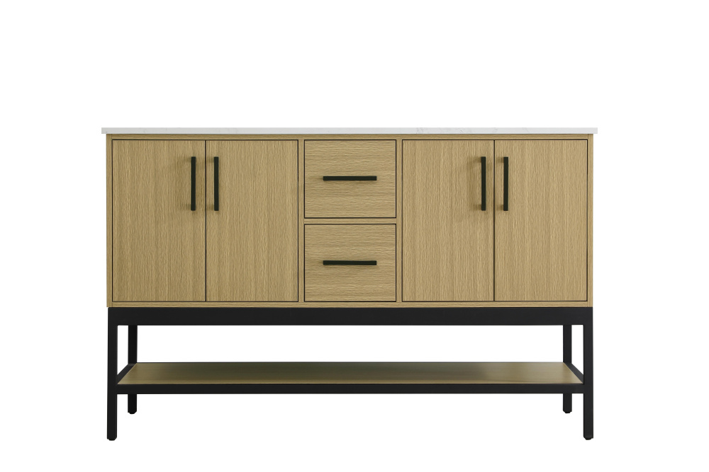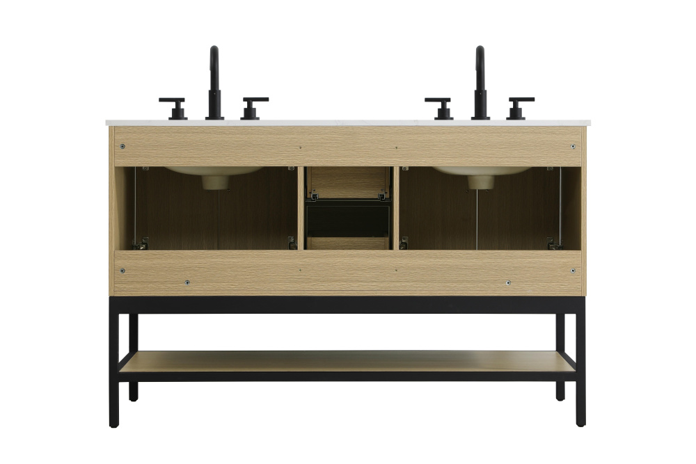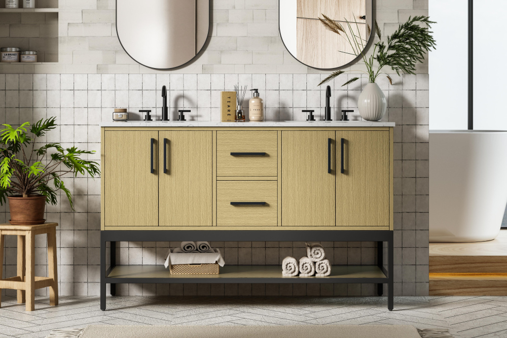 Upgrade your bathroom with this modern bathroom vanity that combines form and function effortlessly. Its sleek wood veneer cabinetry, paired with a bold black metal frame, brings a clean, contemporary vibe to any space. Designed with practicality in mind, this vanity offers soft-close drawers and cabinets to organize your essentials, as well as an open lower shelf for added storage or display. The durable white quartz countertop is built to withstand daily use, while the undermount ceramic sink ensures easy maintenance. Complete with matte black hardware and pre-drilled features for effortless installation, this vanity is the perfect centerpiece to refresh your bathroom with style and efficiency.