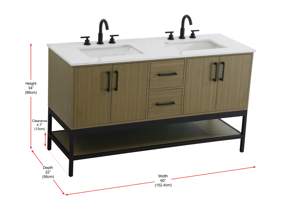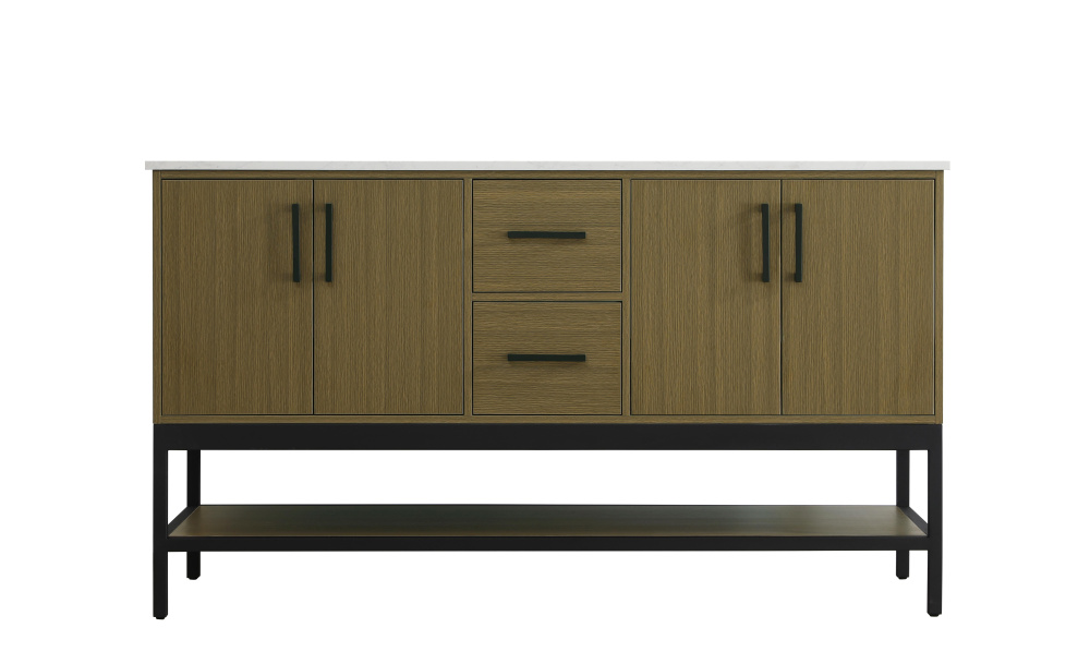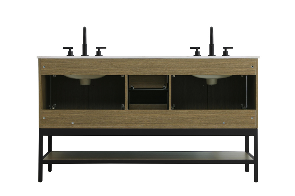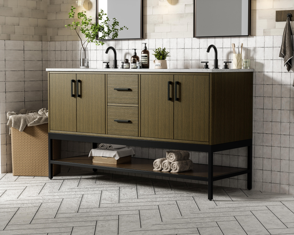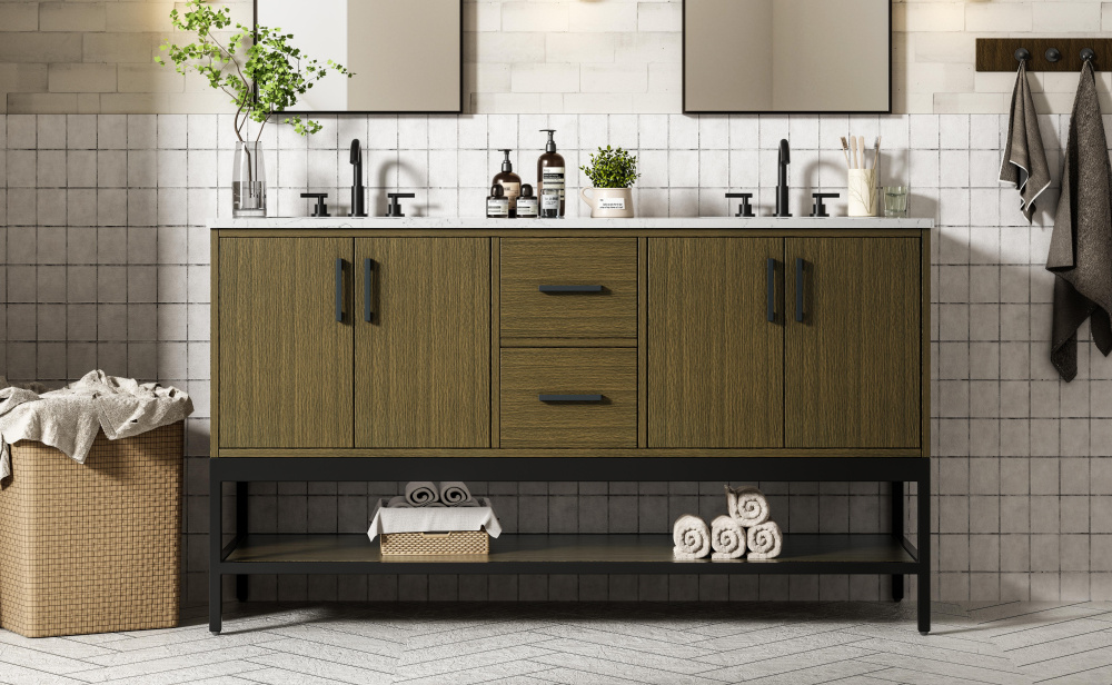 Upgrade your bathroom with this modern bathroom vanity that combines form and function effortlessly. Its sleek wood veneer cabinetry, paired with a bold black metal frame, brings a clean, contemporary vibe to any space. Designed with practicality in mind, this vanity offers soft-close drawers and cabinets to organize your essentials, as well as an open lower shelf for added storage or display. The durable white quartz countertop is built to withstand daily use, while the undermount ceramic sink ensures easy maintenance. Complete with matte black hardware and pre-drilled features for effortless installation, this vanity is the perfect centerpiece to refresh your bathroom with style and efficiency.