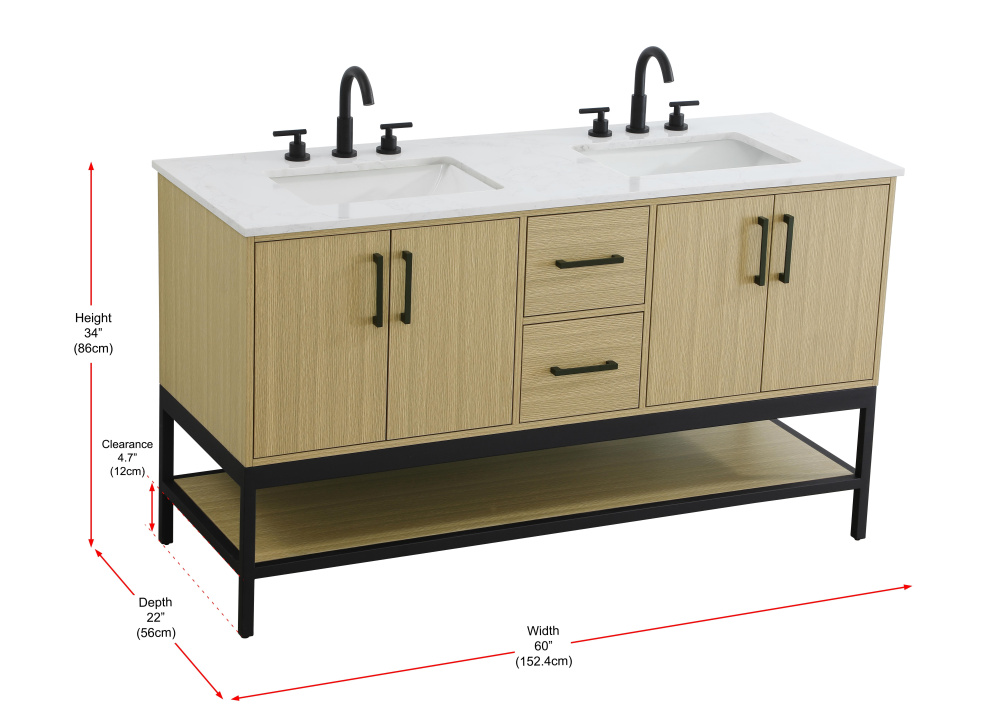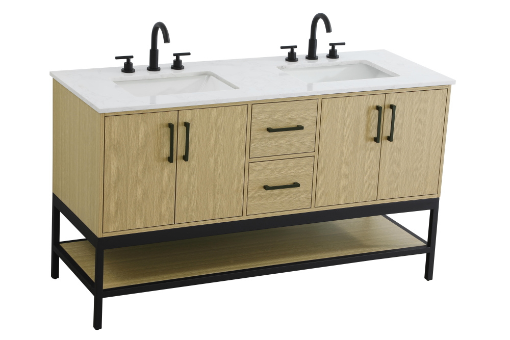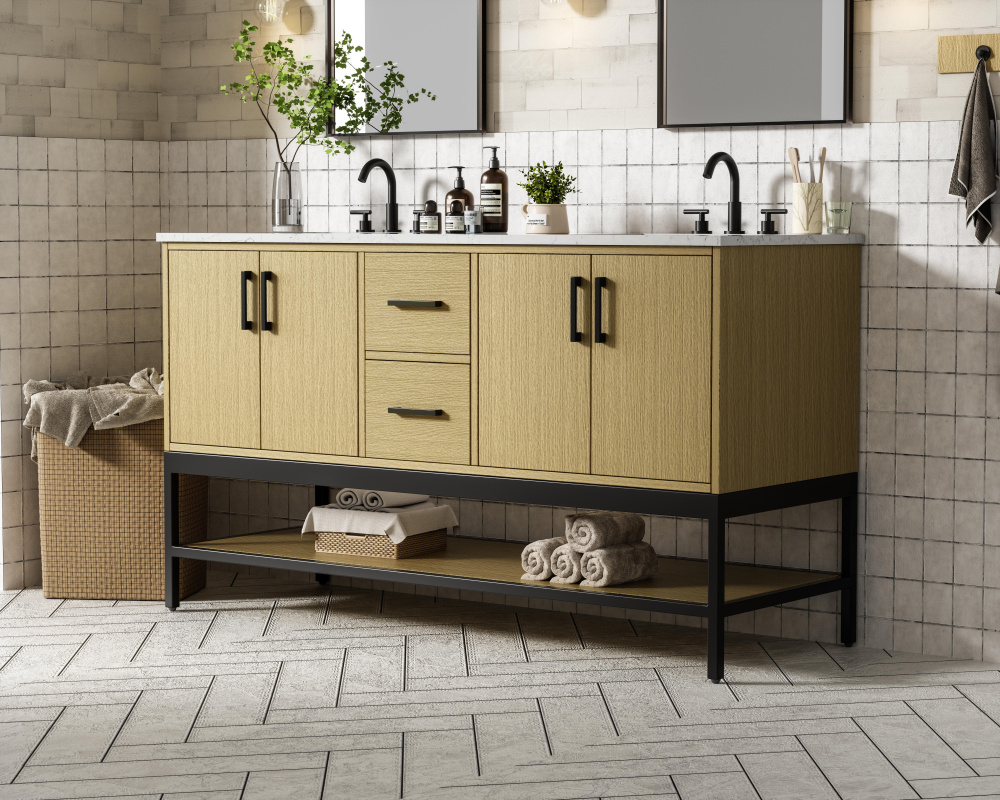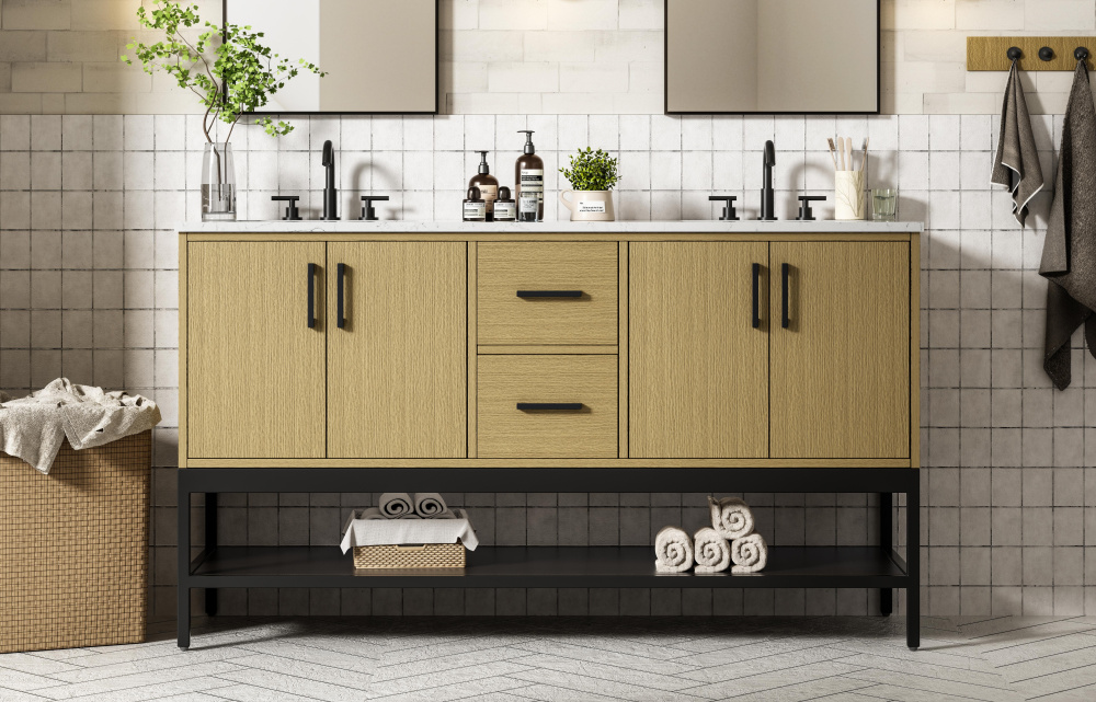 Upgrade your bathroom with this modern bathroom vanity that combines form and function effortlessly. Its sleek wood veneer cabinetry, paired with a bold black metal frame, brings a clean, contemporary vibe to any space. Designed with practicality in mind, this vanity offers soft-close drawers and cabinets to organize your essentials, as well as an open lower shelf for added storage or display. The durable white quartz countertop is built to withstand daily use, while the undermount ceramic sink ensures easy maintenance. Complete with matte black hardware and pre-drilled features for effortless installation, this vanity is the perfect centerpiece to refresh your bathroom with style and efficiency.